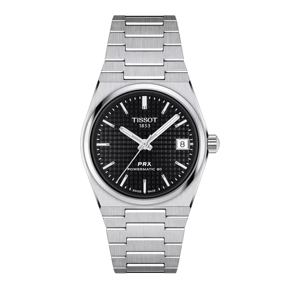 Tissot PRX Powermatic 80 v 35mm provedení nabízí ikonický design inspirovaný 70. lety v kombinaci s moderní švýcarskou technologií. Jeho elegantní 35mm pouzdro z nerezové oceli a charakteristický černý ciferník s vaflovou strukturou vytvářejí luxusní estetiku, která je okamžitě rozpoznatelná. Čelní stranu chrání safírové sklíčko s antireflexní úpravou, které zajišťuje výbornou čitelnost za každého světla.