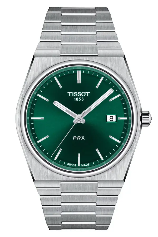 Hodinky Tissot PRX T137.410.11.091.00 jsou úchvatným kouskem, který bezchybně spojuje vintage estetiku s moderní technologií. Tento model je reedicí klasického designu Tissot ze 70. let, disponující pouzdrem z nerezové oceli o průměru 40 mm s charakteristickým tonneau tvarem a integrovaným náramkem z nerezové oceli. Zelený ciferník s efektem slunečního paprsku přidává moderní nádech, krásně odráží světlo a zvyšuje sofistikovaný vzhled hodinek. Ciferník je vybaven luminiscenčními ručičkami a tyčovými indexy, což zajišťuje vynikající čitelnost za různých světelných podmínek.