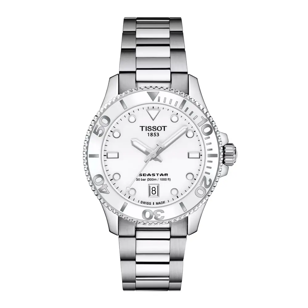Model Tissot Seastar 1000 36mm T120.210.11.011.00 přináší potápěčskou odolnost a švýcarskou preciznost v elegantním kompaktním provedení. Jeho 36mm pouzdro z nerezové oceli 316L doplňuje bílý číselník s výraznými indexy a otočná luneta, které podtrhují sportovní charakter a čistý design.