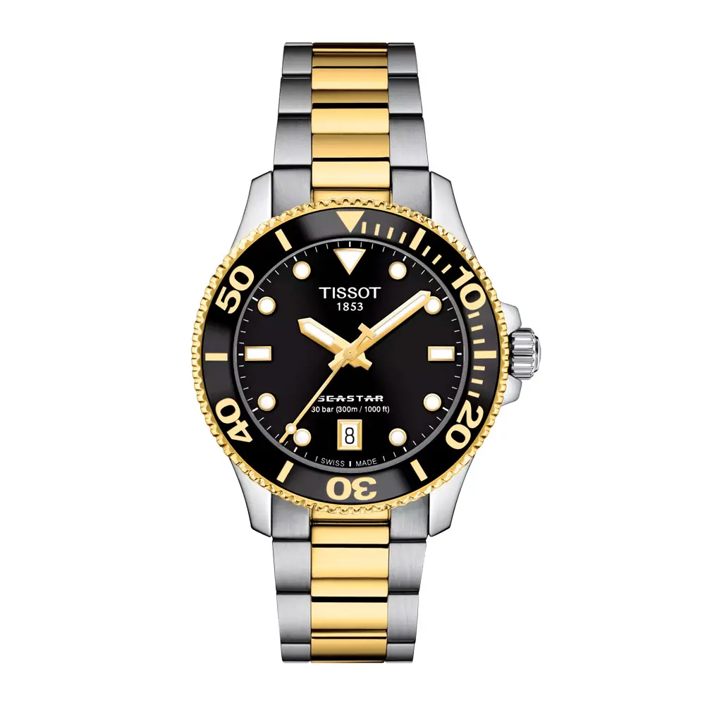 Model Tissot Seastar 1000 36mm T120.210.22.051.00 spojuje potápěčský výkon, švýcarskou preciznost a elegantní styl v kompaktním formátu. Jeho 36mm pouzdro z nerezové oceli 316L s dvoubarevným PVD povrchem v odstínu žlutého zlata doplňuje černý číselník s luminiscenčními ručičkami a indexy, který zaručuje perfektní čitelnost i pod vodou.