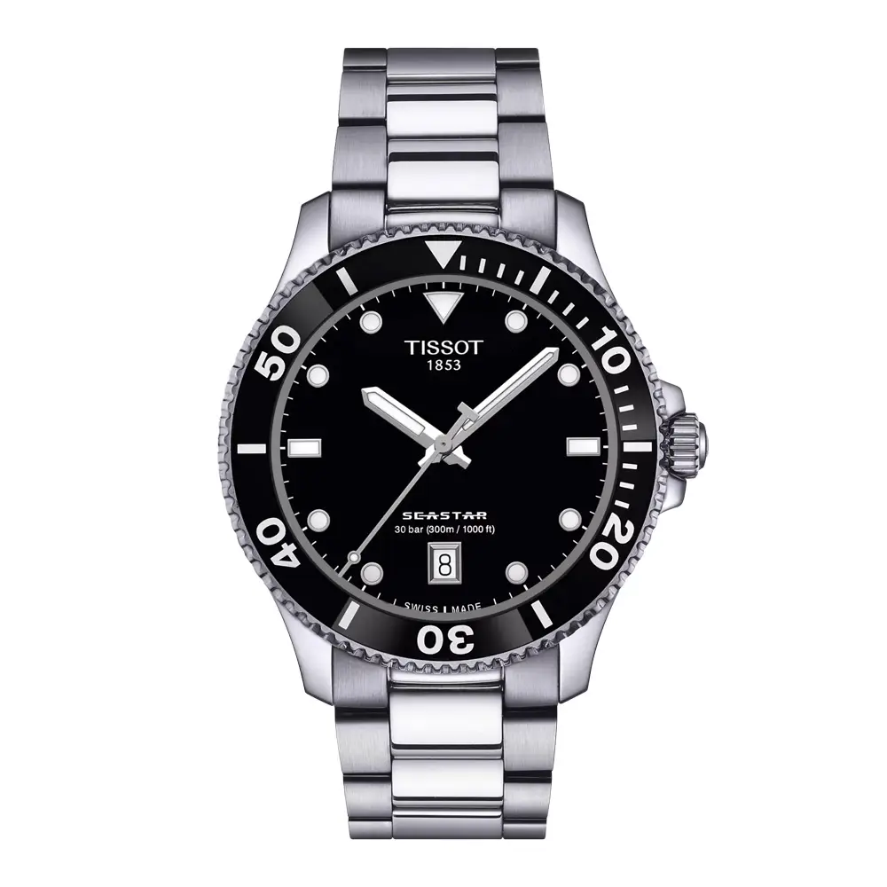Model Tissot Seastar 1000 40 mm T120.410.11.051.00 představuje sportovní potápěčské hodinky v univerzální velikosti, které kombinují technickou odolnost se stylovým čistým designem pro každodenní i outdoorové použití. Černý ciferník s kontrastními indexy a ručkami s luminiscencí Super-LumiNova® zajišťuje skvělou čitelnost ve dne i ve tmě, čímž podtrhuje robustní sportovní charakter modelu.