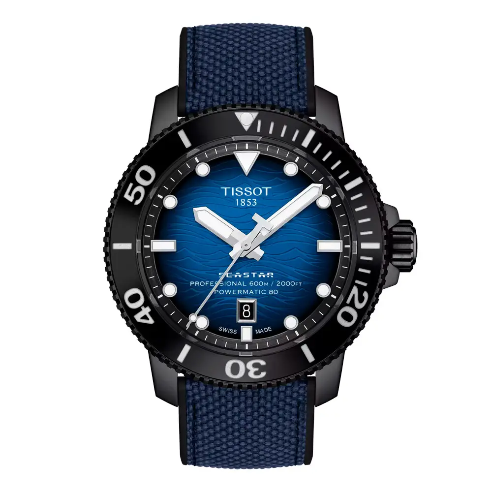Tissot Seastar 2000 Professional Automatic T120.607.37.041.00 spojuje profesionální výkon, moderní design a švýcarskou preciznost. Jeho 46mm ocelové pouzdro s černou PVD úpravou doplňuje modrý gradientní číselník s vlnkovým vzorem, luminiscenční ručky a indexy, které zajišťují dokonalou čitelnost i pod vodou. Jednosměrně otočná keramická luneta a šroubovací korunka podtrhují potápěčský charakter modelu.