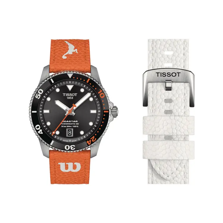 Model je doplněn o výrazný oranžový kožený pásek s trnovou sponou, který připomíná texturu basketbalového míče a dodává hodinkám unikátní sportovní charakter. Díky vodotěsnosti 30 ATM (300 m) jsou ideální pro potápění i náročné vodní sporty.
