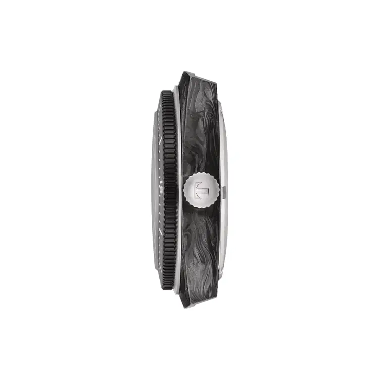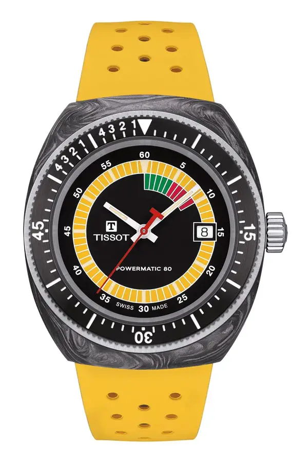 Pouzdro hodinek je vyrobeno z lehkého kovaného karbonu a má charakteristický tvar 'tonneau' (sudu). Na černém ciferníku jsou výrazné žluté značky minut, zelené a červené akcenty a luminiscenční ručičky pokryté Super-LumiNova® pro lepší čitelnost ve tmě. Safírové sklíčko je antireflexní a odolné proti poškrábání, což zaručuje dlouhou životnost hodinek.