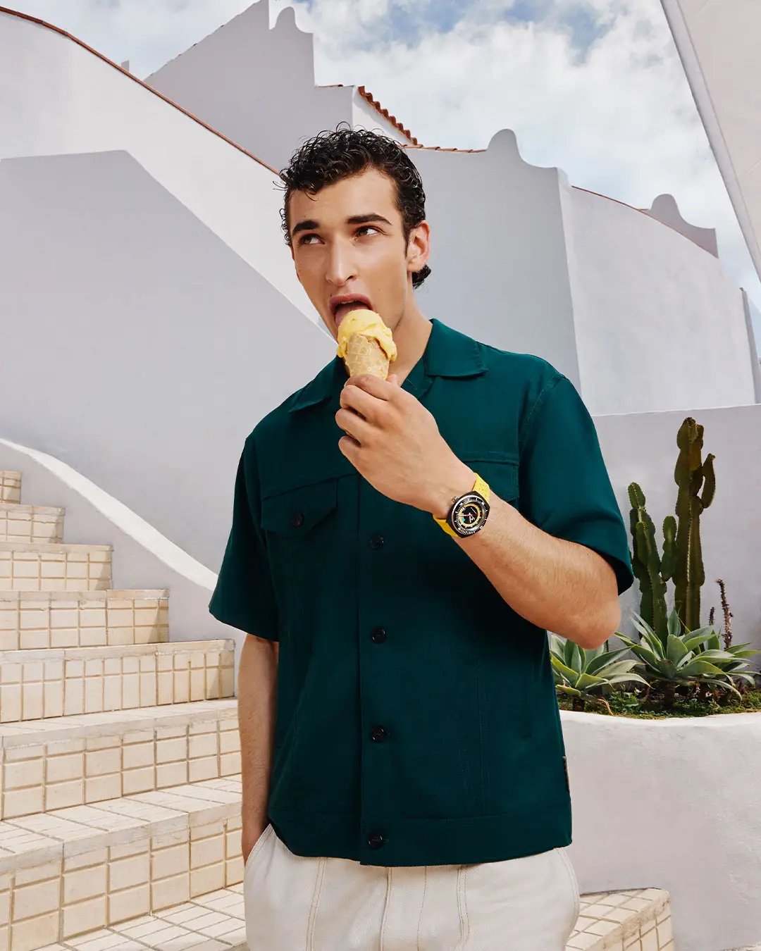 Hodinky mají vodotěsnost do 300 metrů (30 bar), což je ideální pro milovníky vodních sportů. Unikátní perforovaný gumový řemínek v jasně žluté barvě přidává hodinkám na atraktivitě a pohodlí při nošení. Navíc hodinky mají inovativní systém zapínání bez tradiční spony, což zajišťuje bezpečné a pohodlné upevnění na zápěstí.