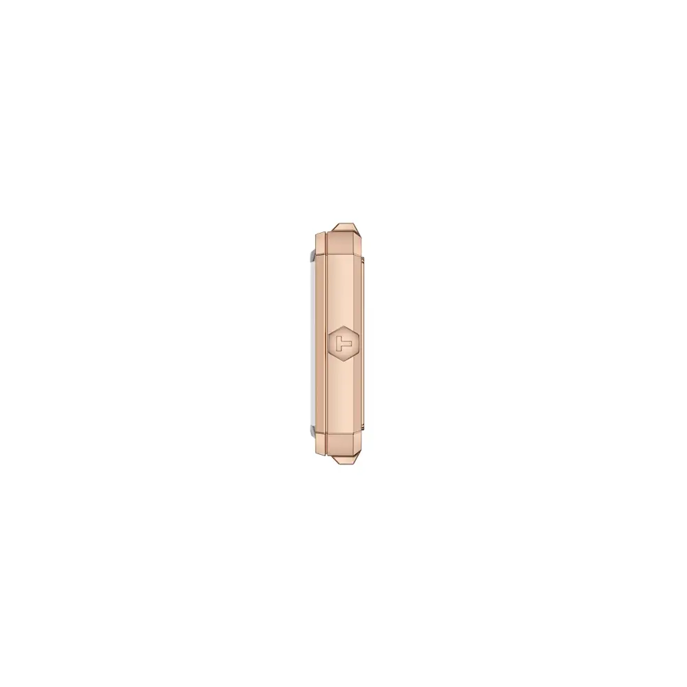 Pouzdro je vyrobeno z 316L nerezové oceli s karnační (rose gold) PVD povrchovou úpravou a chráněno safírovým sklíčkem odolným proti poškrábání. Hodinky mají elegantní obdélníkový tvar s rozměry přibližně 30 × 21,8 mm a tenkým profilem 7,25 mm, díky čemuž působí velmi subtilně a pohodlně na zápěstí. Model nabízí také vodotěsnost 5 ATM (50 m), která chrání hodinky při běžném kontaktu s vodou.