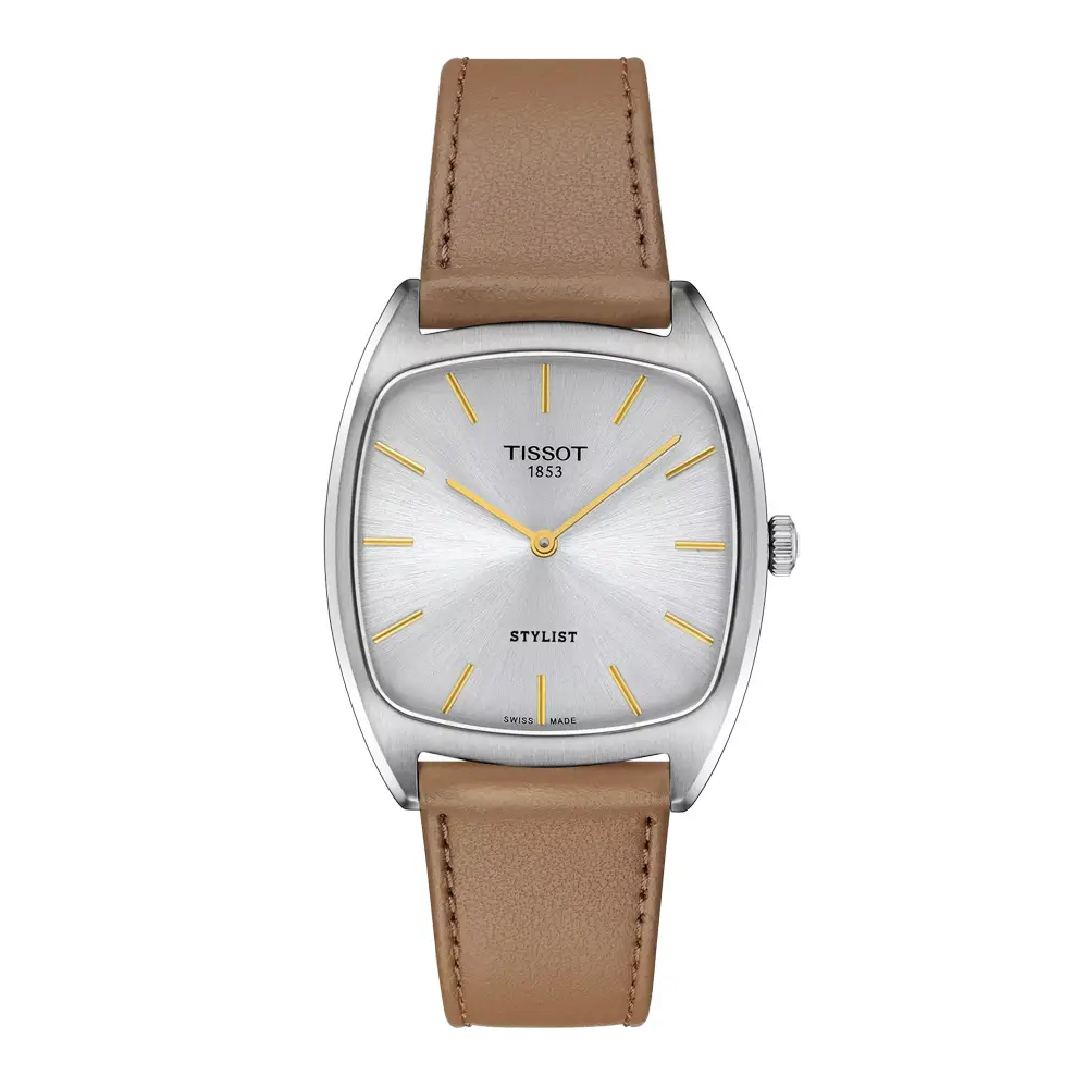 Tissot Stylist je elegantní unisex model, který spojuje moderní minimalistický design s nadčasovým charakterem. Hranaté pouzdro o rozměrech 32 × 32 mm z ušlechtilé oceli 316L doplňuje stříbrný sunburst ciferník, jenž vytváří jemné světelné odlesky a působí velmi čistým, sofistikovaným dojmem. Celkovou eleganci podtrhuje hnědý kožený řemínek, který doplňuje klasický a univerzální vzhled vhodný pro ženy i muže.