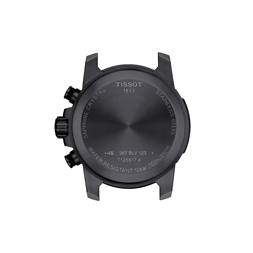 Model Tissot Supersport Chrono zaujme svým moderním sportovním designem s nádechem robustní elegance. Jeho 45,5mm pouzdro z nerezové oceli s černou PVD úpravou doplňuje černý ciferník s kontrastními indexy a ručičkami, které zajišťují dokonalou čitelnost v jakémkoli světle.