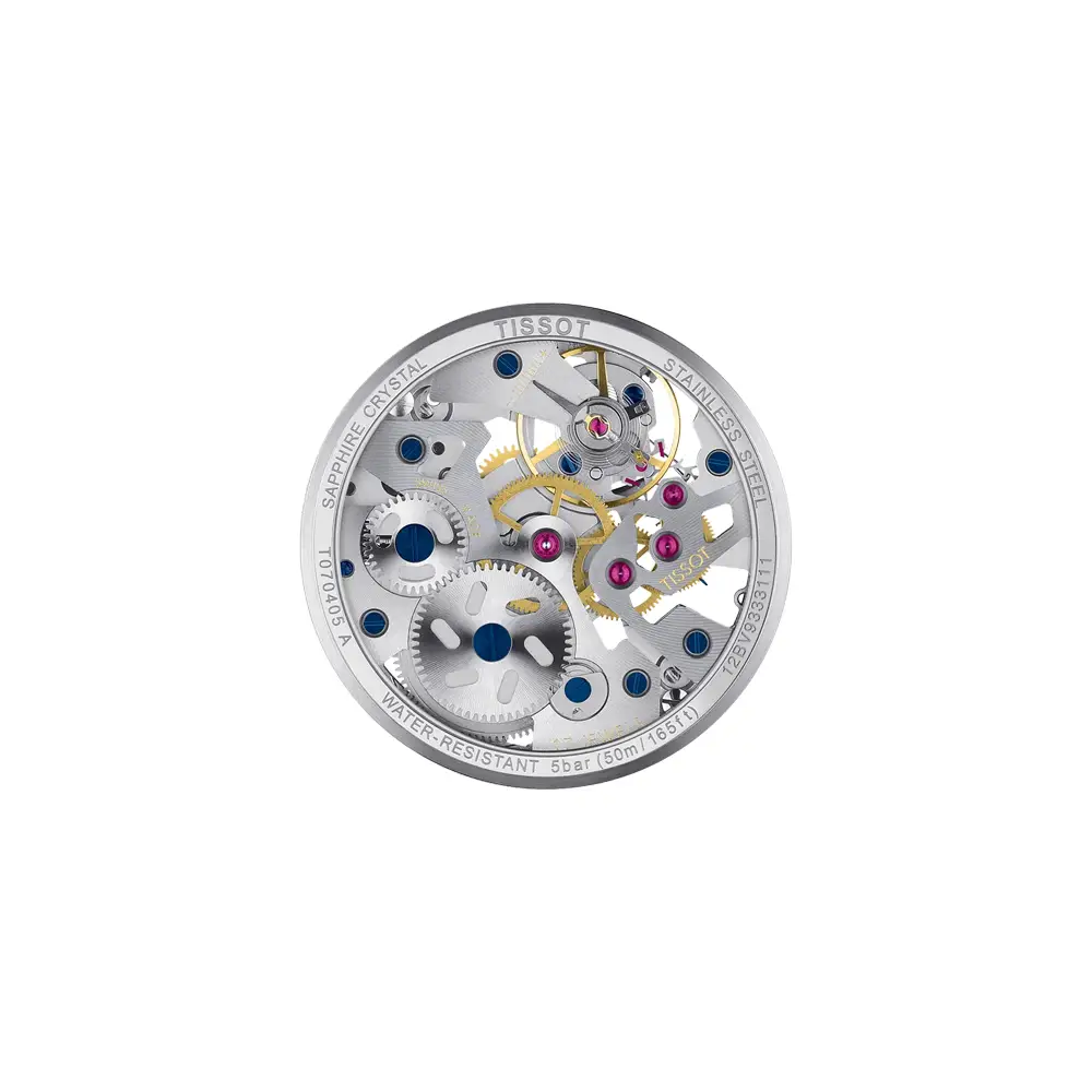 Hodinky Tissot T-Complication Squelette T070.405.16.411.00 představují dokonalé propojení tradiční švýcarské hodinářské práce a moderního technického designu. Jejich dominantou je ikonický skeletonový ciferník, který odhaluje precizně zpracovaný mechanický strojek ETA 6497-1 s ručním nátahem, 17 kameny, frekvencí 18 000 kmitů za hodinu a rezervou chodu přibližně 46 hodin. Díky průhlednému zadnímu dýnku je mechanismus viditelný i z druhé strany, což z hodinek činí skutečné umělecké dílo pro milovníky mechaniky.