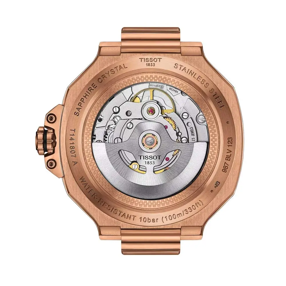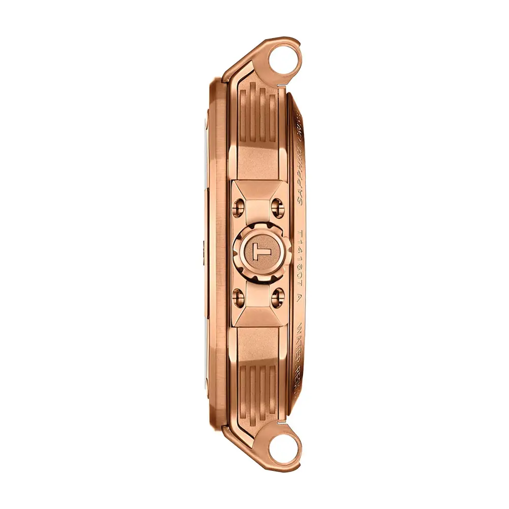 Model Tissot T-Race Powermatic 80 41mm T141.807.37.051.00 spojuje sportovní DNA značky Tissot s precizní švýcarskou mechanikou. Jeho 41mm pouzdro z nerezové oceli 316L s růžově zlatou PVD úpravou doplňuje černý číselník s texturou a výraznými indexy, inspirovaný estetikou motocyklových přístrojů.