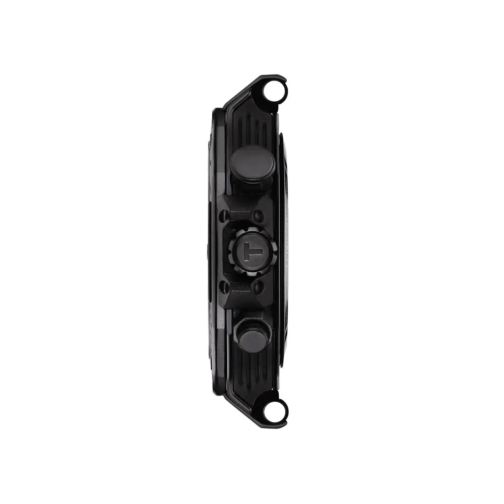 Tissot T‑Race Quartz Chronograph ztělesňuje sportovní energii inspirovanou světem motocyklových závodů. Jeho 45mm pouzdro z nerezové oceli s černou PVD úpravou doplňuje výrazná luneta ve tvaru brzdového kotouče a boční tlačítka evokující ovladače řídítek. Černý ciferník s jemnými výřezy doplňují akcenty v teal zelené barvě, luminiscenční ručky, chronografové subčíselníky a praktické zobrazení data.