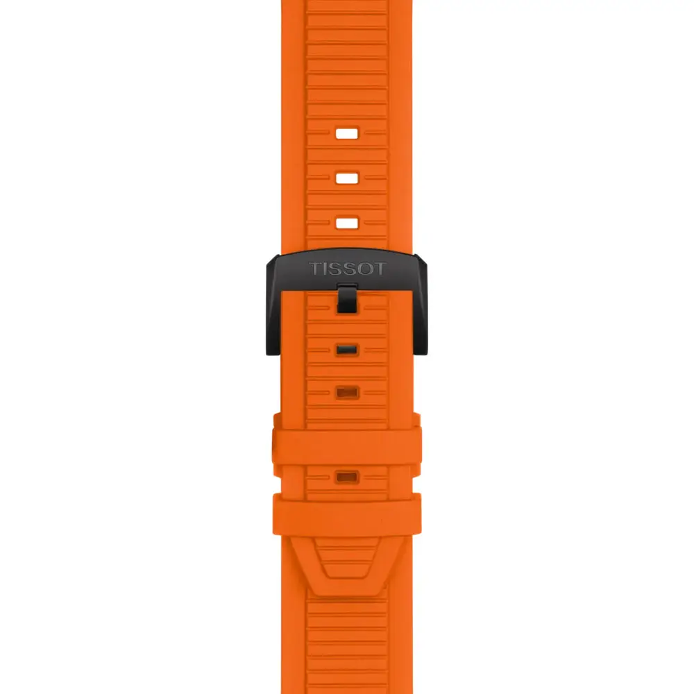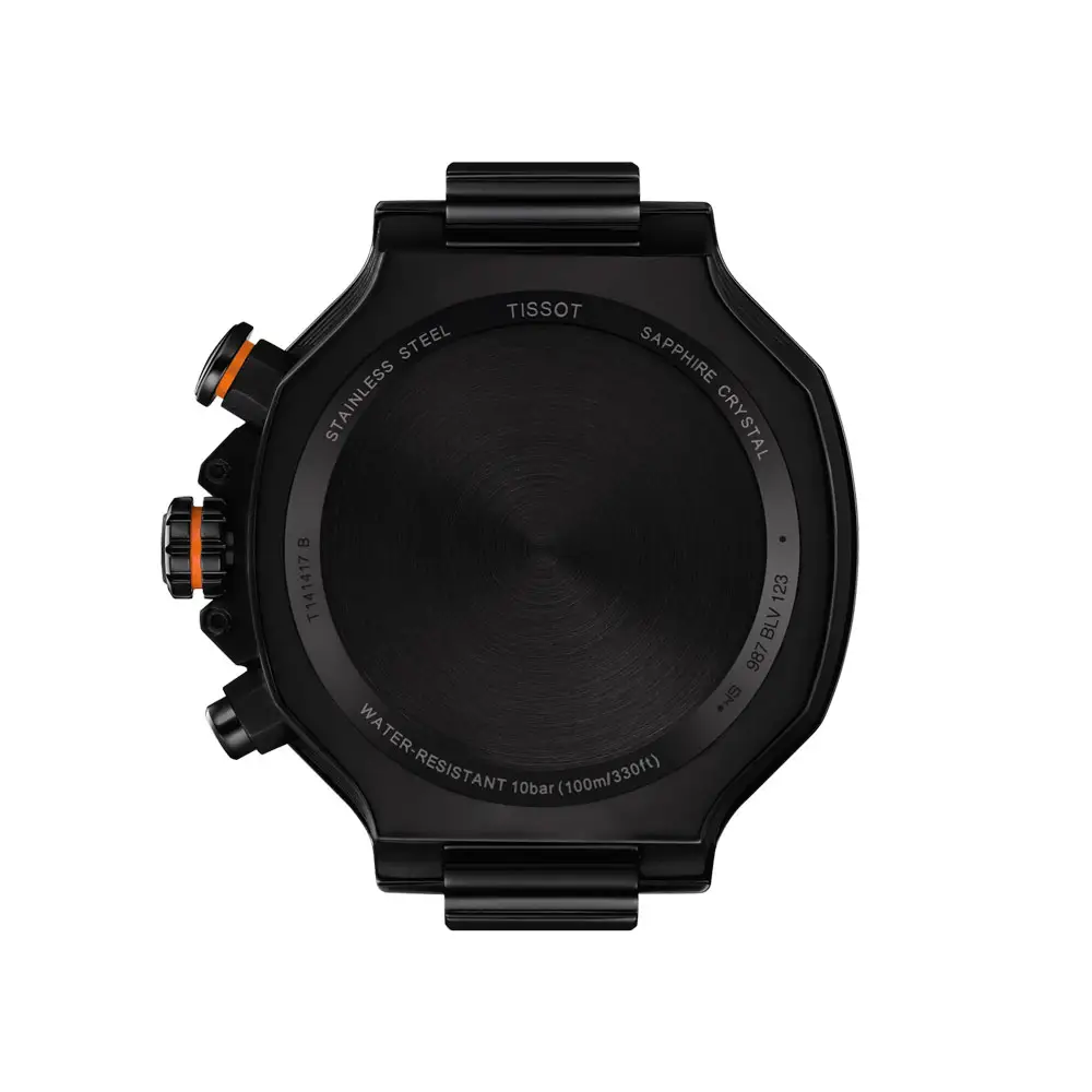 Model Tissot T-Race Quartz Chronograph T141.417.37.051.02 ztělesňuje vášeň pro motorismus, výkon a precizní švýcarskou technologii. Jeho 45mm pouzdro z nerezové oceli 316L s černou PVD úpravou doplňuje černý číselník s oranžovými detaily, inspirovaný estetikou závodních motocyklů.