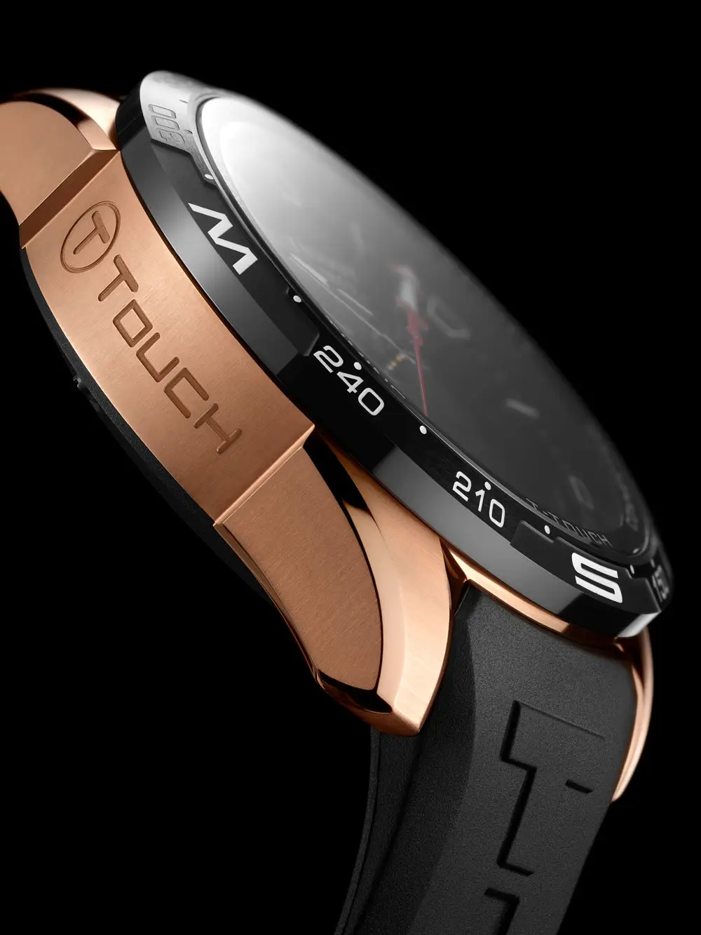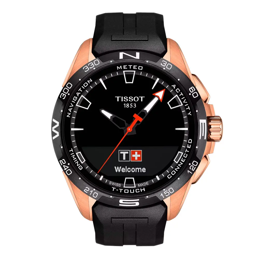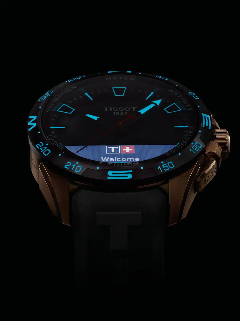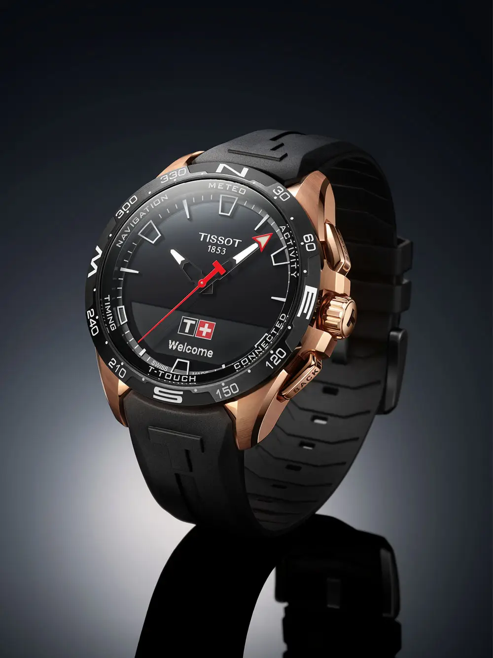 Tissot T-Touch Connect Solar představují špičkový model, který spojuje inovativní technologie, solární napájení a charakteristický sportovní design. Hodinky stojí na pomezí klasických a chytrých modelů, a jsou tak ideální volbou pro ty, kdo chtějí propojit tradiční švýcarské hodinářství s moderní konektivitou. Titanové pouzdro s růžovým zlacením a keramickou lunetou doplňuje kombinovaný analogově-digitální ciferník chráněný safírovým sklíčkem s vysokou odolností.