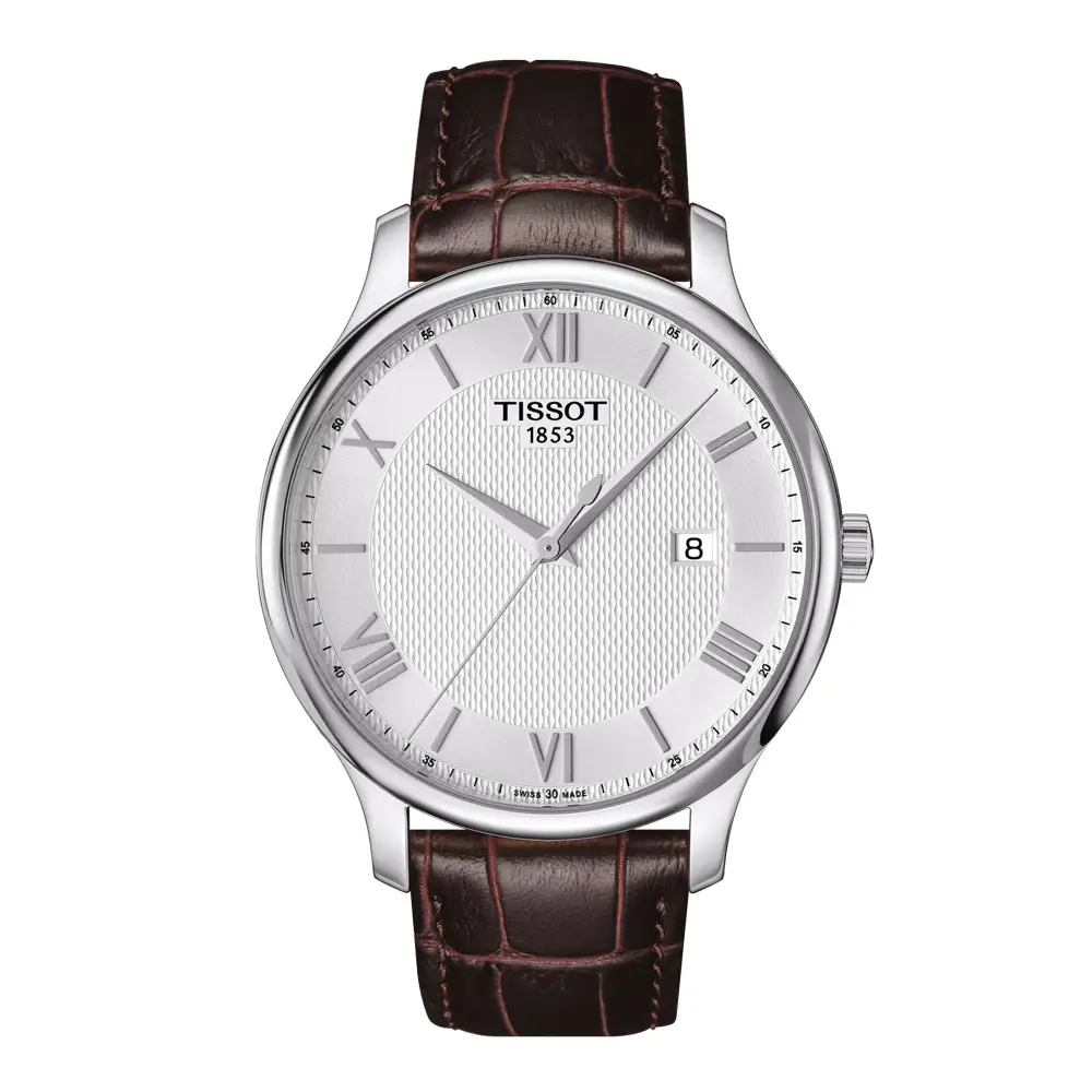 Model Tissot Tradition T063.610.16.038.00 kombinuje klasický design s moderní elegancí a značkou švýcarské preciznosti. Pouzdro z nerezové oceli 316L o průměru 42 mm dodává hodinkám výrazný, ale stále vyvážený rozměr. Na stříbrném číselníku najdeme římské číslice a jemné indexy, které zaručují nadčasový a sofistikovaný vzhled, doplněný hnědým koženým řemínkem pro komfortní nošení.