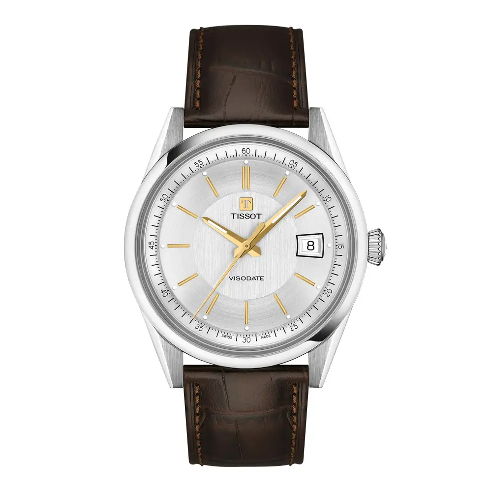 Pánské hodinky Tissot Visodate Powermatic 80 (ref. T157.407.16.031.00) představují moderní interpretaci ikonického modelu z 50. let v elegantním vintage stylu. Pouzdro o průměru 39 mm z nerezové oceli 316L nabízí vyvážené proporce pro každodenní i formální nošení. Design doplňuje klenuté safírové sklíčko s antireflexní úpravou, které podtrhuje klasický charakter modelu. Vodotěsnost 50 m (5 ATM) zajišťuje spolehlivost při běžném používání.