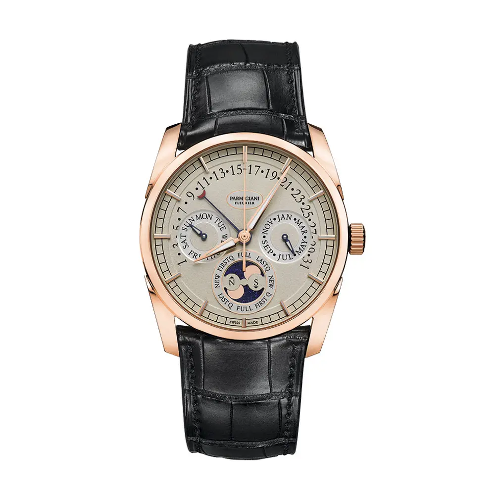 Model Parmigiani Fleurier Tonda Calendrier Annuel s referencí PFC272-1002401-HA1242 je mistrovským dílem švýcarské haute horlogerie, které v sobě snoubí klasickou eleganci, pokročilou mechaniku a jedinečné hodinářské řemeslo. Tento 40mm model je vyroben z 18kt růžového zlata, což mu dodává hřejivý luxusní vzhled, umocněný ručně šitým hnědým koženým řemínkem z aligátora Hermès.