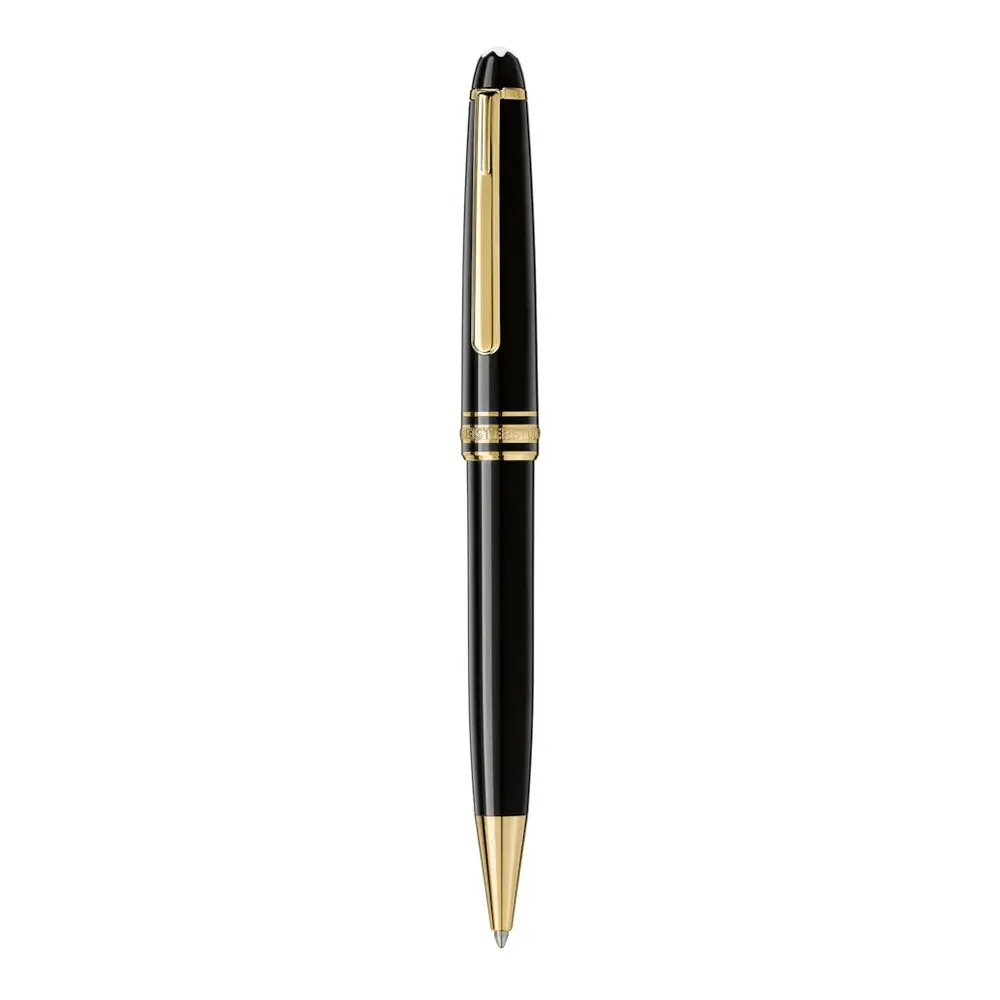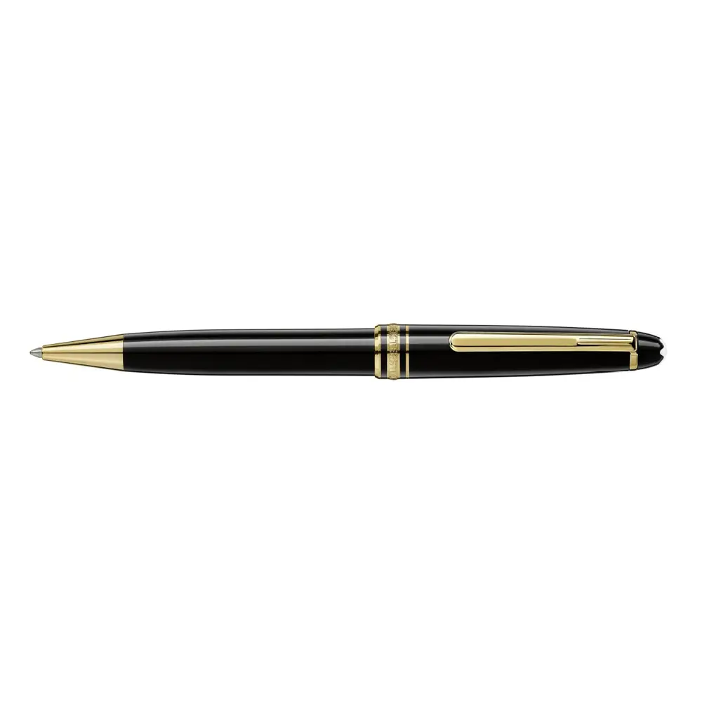 Chiếc bút bi Montblanc Meisterstück Classique là biểu tượng của sự thanh lịch và tinh xảo vượt thời gian. Thân bút được chế tác từ nhựa đen cao cấp, kết hợp chi tiết mạ vàng tạo nên vẻ sang trọng cổ điển.
