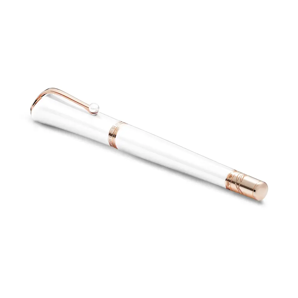Thiết kế được hoàn thiện với kẹp bút mạ vàng hồng đính ngọc trai, tượng trưng cho niềm yêu thích trang sức ngọc trai của Marilyn Monroe. Trên đỉnh nắp bút là biểu tượng Montblanc, thể hiện sự sang trọng và chất lượng của sản phẩm. Montblanc Muses Marilyn Monroe Special Edition Pearl không chỉ là một dụng cụ viết thanh lịch mà còn là món đồ sưu tầm giá trị.