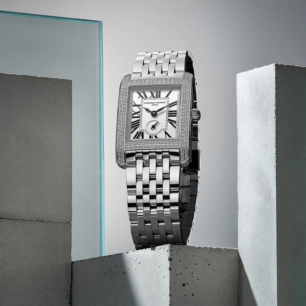 Đồng hồ Frederique Constant Classics Carrée Small Seconds FC-235S2CD6B là sự kết hợp hoàn hảo giữa trang sức và nghệ thuật chế tác đồng hồ theo phong cách Art Deco thanh lịch. Vỏ hình chữ nhật (36 × 25,2 mm) bằng thép không gỉ đánh bóng được đính 158 viên kim cương (1,185 ct), mang lại vẻ ngoài sang trọng. Kính sapphire chống trầy xước với lớp phủ chống phản chiếu đảm bảo hiển thị rõ ràng, trong khi khả năng chống nước 30 m (3 ATM) phù hợp cho sử dụng hằng ngày.