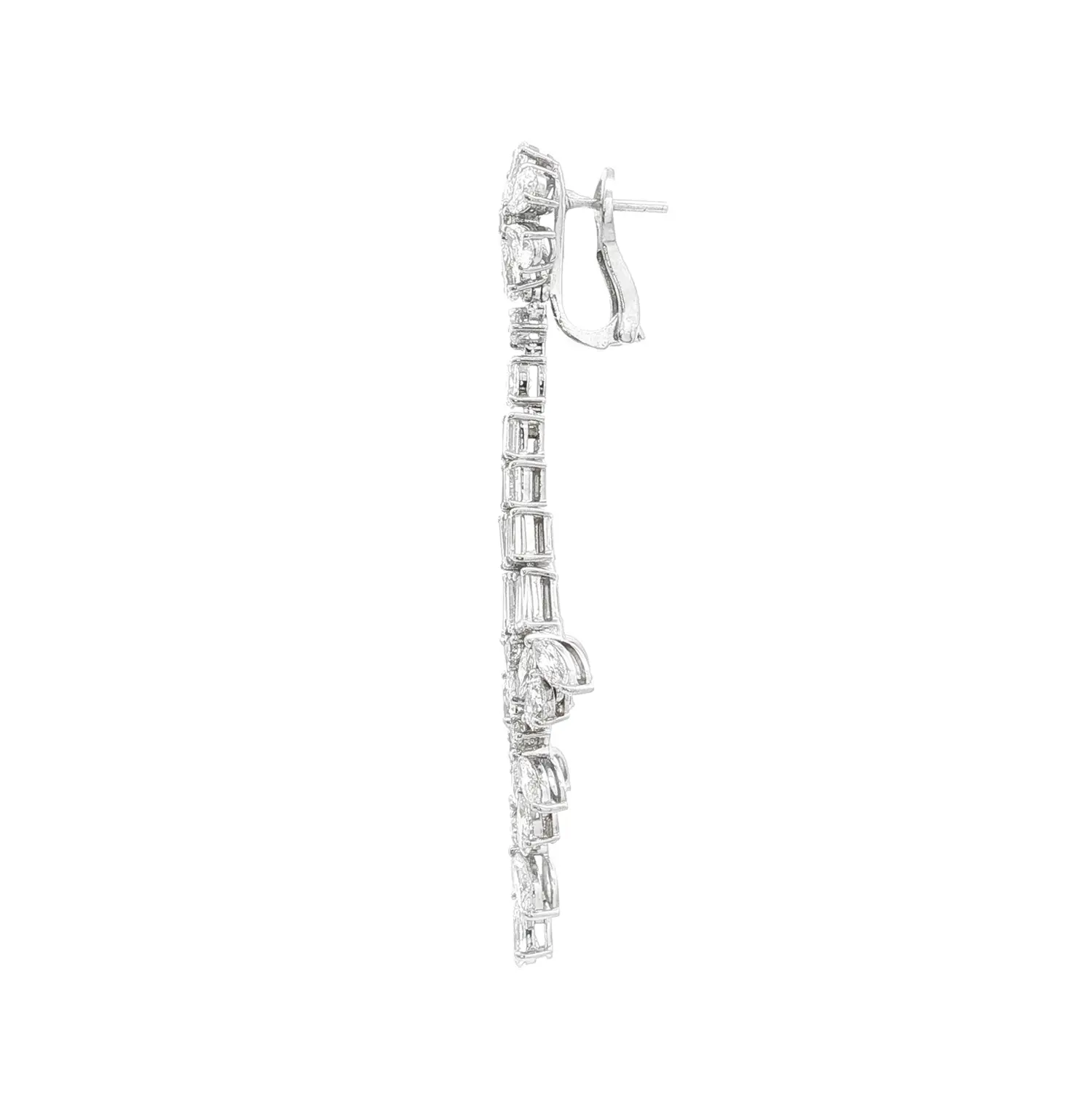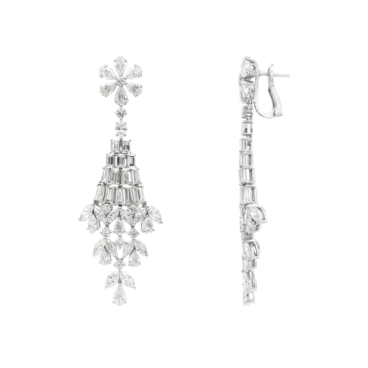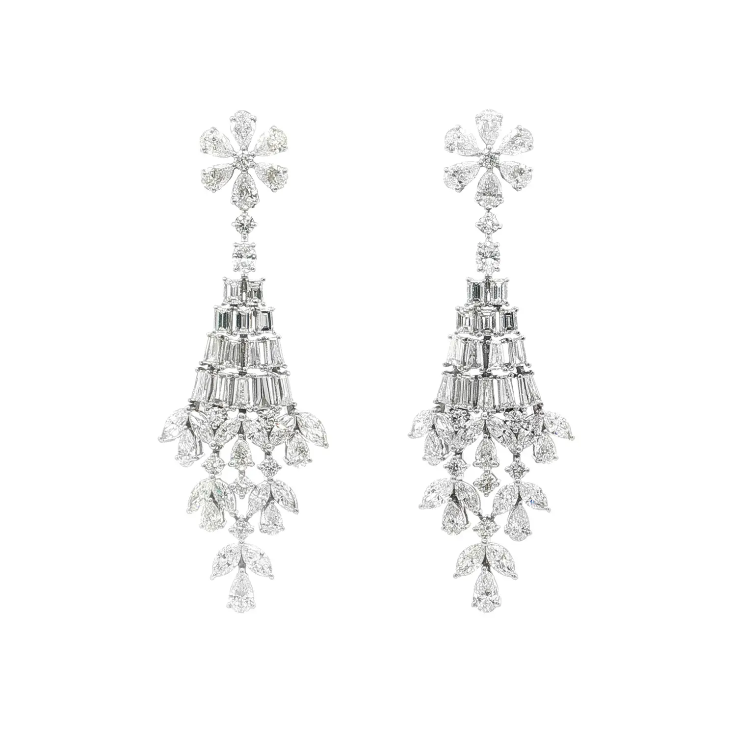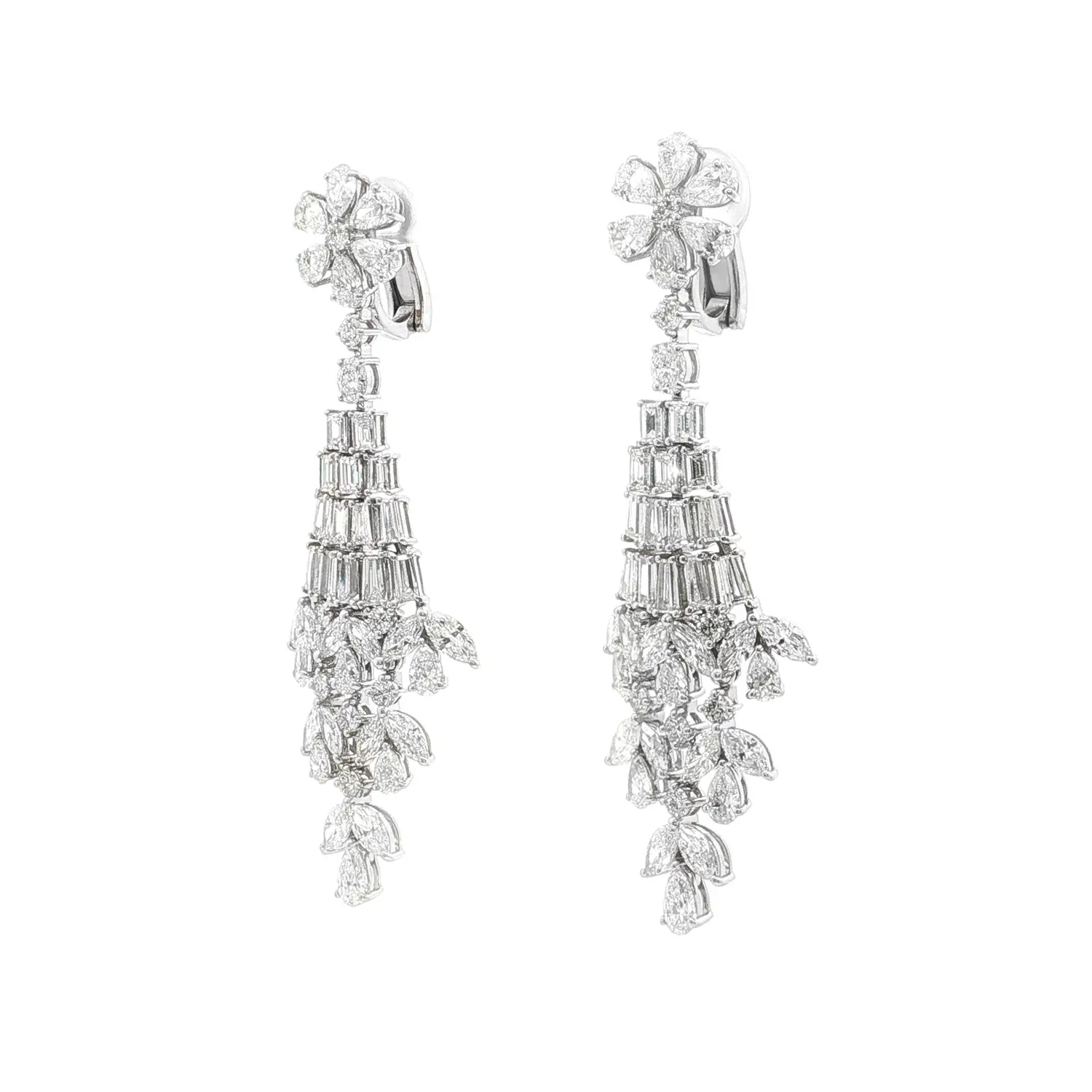 Tyto úchvatné visací náušnice z bílého zlata představují mistrovské šperkařské dílo, v němž se snoubí precizní zpracování, dokonalá symetrie a oslnivý třpyt diamantů. Jejich konstrukce připomíná elegantní kaskádu složenou z několika úrovní – horní část ve tvaru květu tvoří diamanty brusu kapky, které postupně přecházejí do jemně se rozšiřujícího těla náušnice s diamanty brusu baguette a pear. Výsledkem je kompozice, která při pohybu nádherně odráží světlo a vytváří efekt živého lesku.
