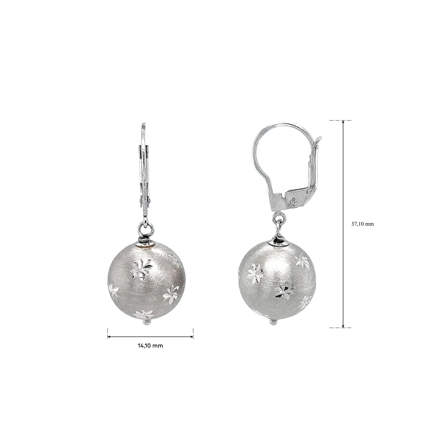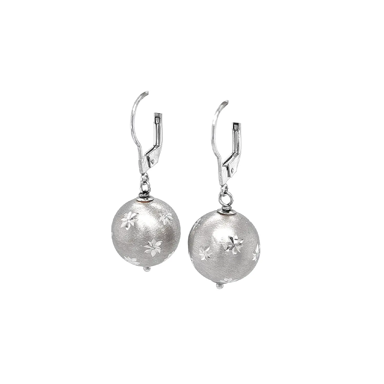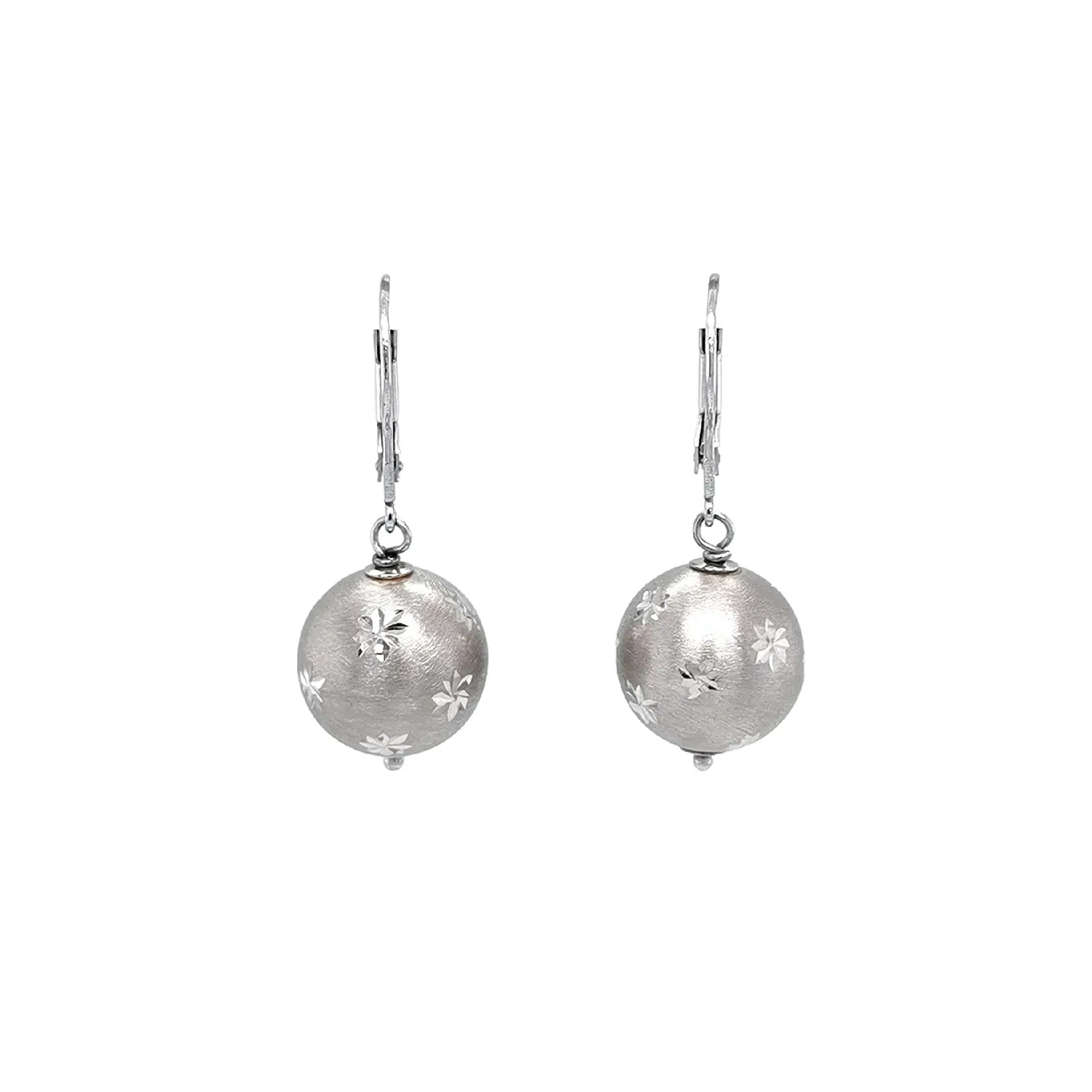 Tyto visací náušnice z bílého zlata s kulovým motivem zaujmou jemně strukturovaným povrchem a dekorativním rytím ve tvaru drobných hvězdiček. Matný efekt v kombinaci s lesklými detaily vytváří elegantní kontrast a dodává šperku lehký, slavnostní charakter.