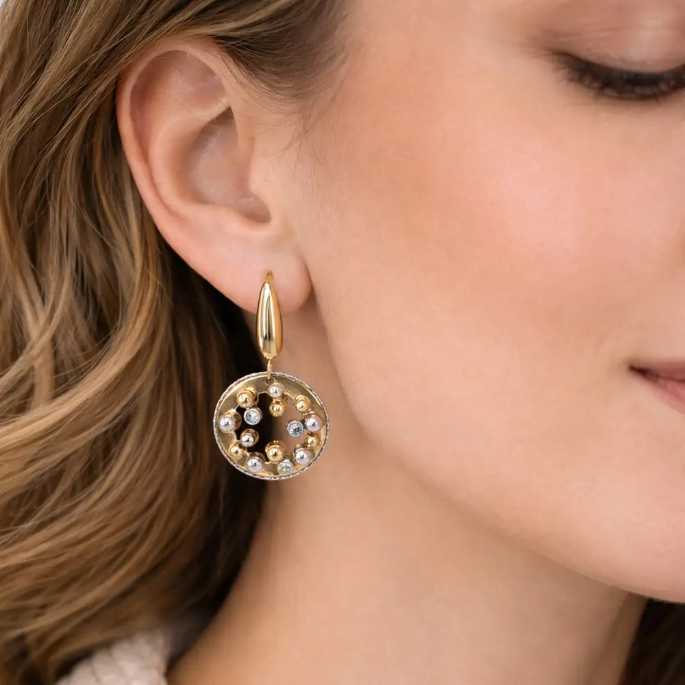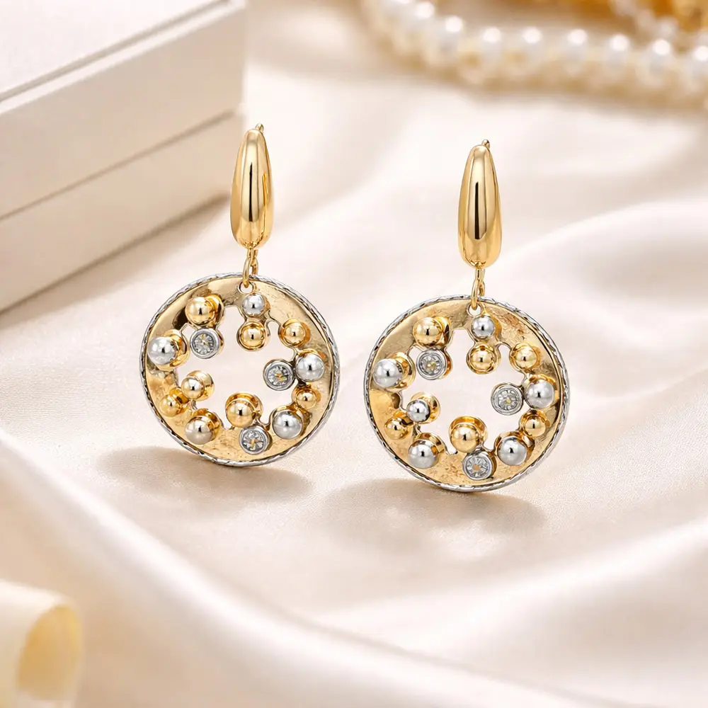Tyto visací náušnice z kombinovaného zlata zaujmou originálním kruhovým motivem, ve kterém se harmonicky prolínají žluté a bílé zlaté tóny. Strukturovaný povrch disku je oživen plastickým dekorem drobných leštěných kuliček a jemně třpytivých detailů, které dodávají šperku hloubku, eleganci a moderní výraz.