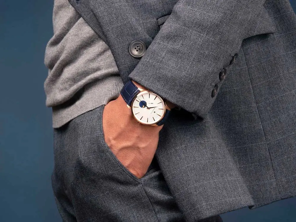 Stříbrný ciferník hodinek je zdoben vzorem slunečních paprsků a je vybaven fasetovanými indexy a ručkami. Na pozici 6 hodin se nachází ukazatel měsíčních fází, který je hlavním vizuálním prvkem tohoto modelu, zatímco na pozici 9 hodin je umístěn malý sekundový čítač. Hodinky jsou doplněny modrým řemínkem z aligátoří kůže, který má vnitřní stranu potaženou gumou pro větší pohodlí a odolnost.
