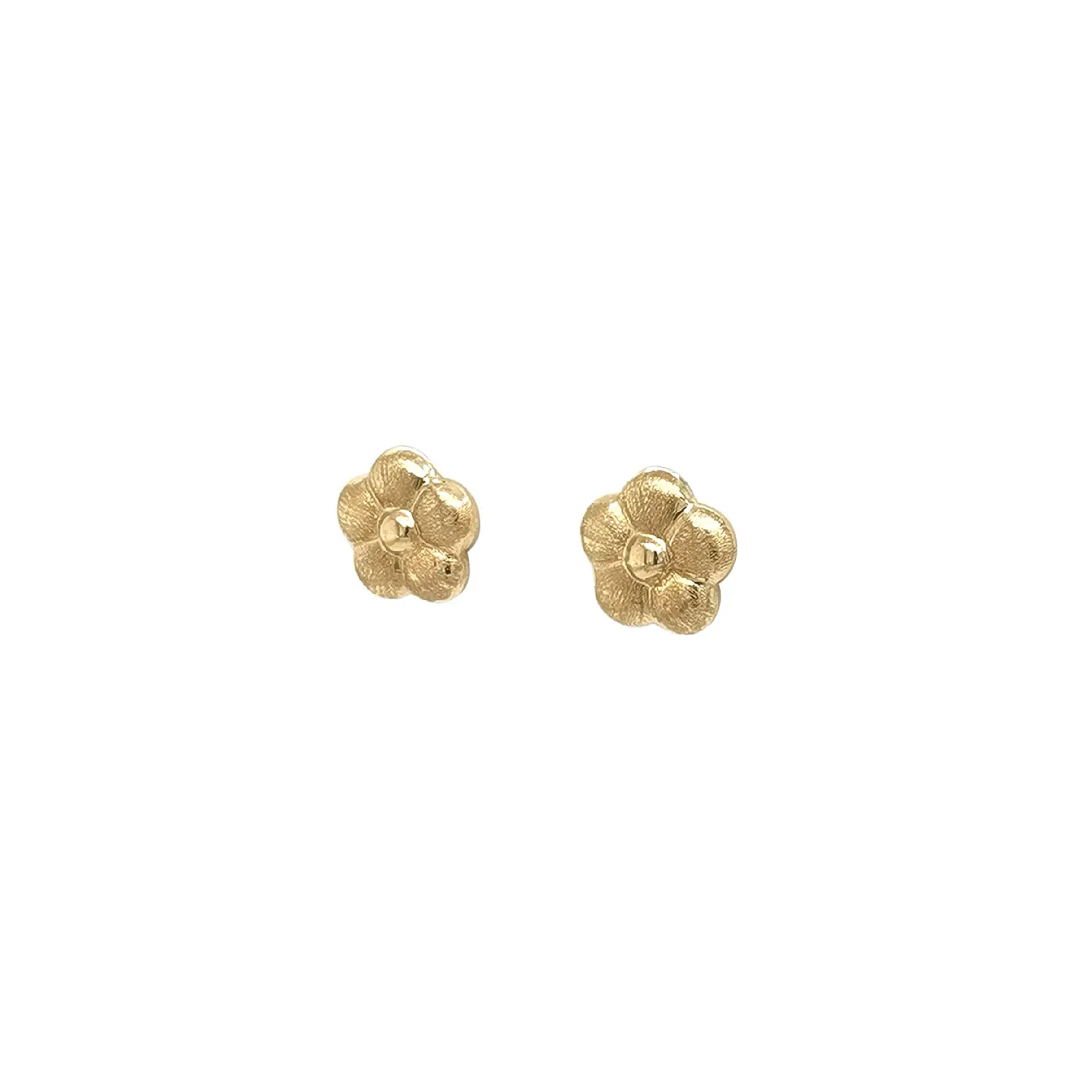 Jemné zlaté náušnice ve tvaru květinek působí elegantně a zároveň hravě díky svému matnému povrchu, který zvýrazňuje strukturu jednotlivých okvětních lístků. Leštěný střed dodává šperku jemný kontrast a vytváří příjemný, přirozený lesk. Díky své decentní velikosti jsou náušnice vhodné jak pro děti, tak pro dospělé.