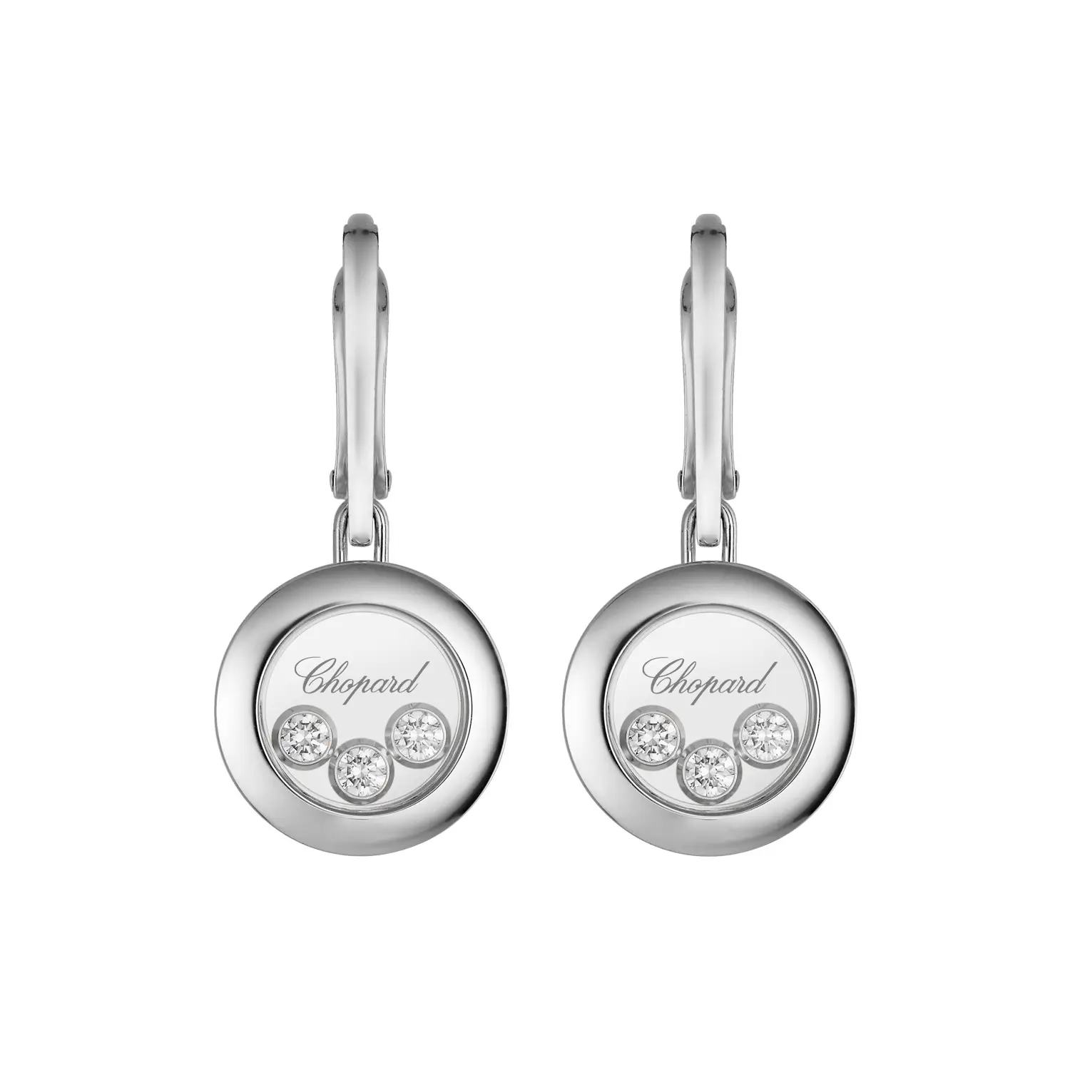 Náušnice Chopard Happy Diamonds Icons 83A018-1301 představují ztělesnění čisté elegance a radosti ze světla. Vyrobeny z 18k etického bílého zlata, zdobeny volně pohyblivými brilianty o celkové hmotnosti přibližně 0,30 ct, které se ladně otáčejí mezi dvěma safírovými sklíčky – ikonický motiv kolekce Happy Diamonds, symbol svobody, štěstí a ženskosti.