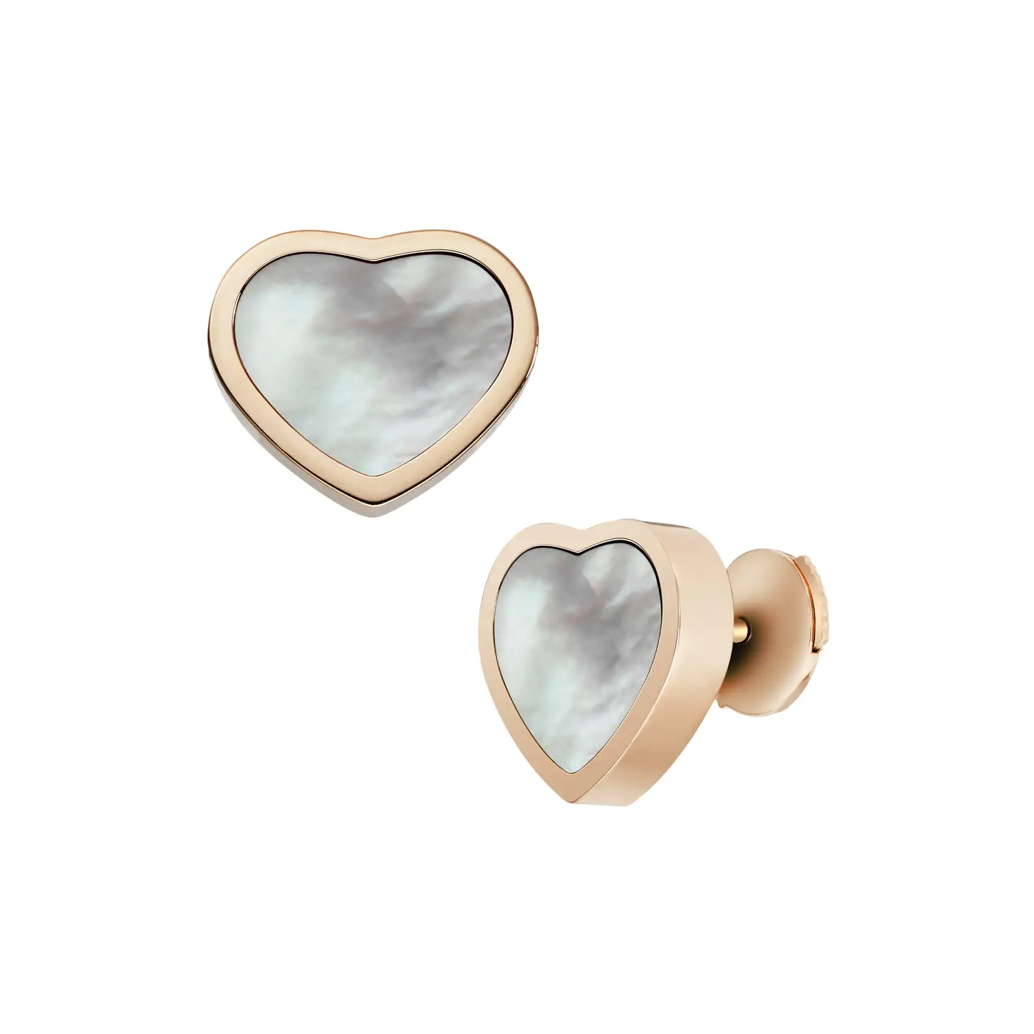 Náušnice Chopard Happy Hearts 839482-5301 propojují romantický design s jemným luxusem. Vyrobeny z 18k růžového zlata, zdobeny dvěma srdíčky z bílé perleti, která září jemným leskem a symbolizují čistotu a ženskost – charakteristický motiv kolekce Happy Hearts. Každý detail vyjadřuje radost a eleganci typickou pro značku Chopard.