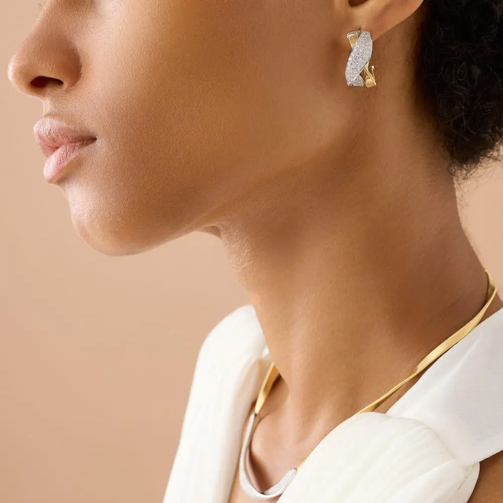 Centrální estetický prvek tvoří diamantové pavé osazení, které klade briliantově broušené diamanty podél zkroucených linií. Tyto diamanty dodávají šperkům přirozeně bohatý lesk a třpyt, aniž by působily příliš okázale, takže náušnice působí zároveň luxusně i vyváženě.