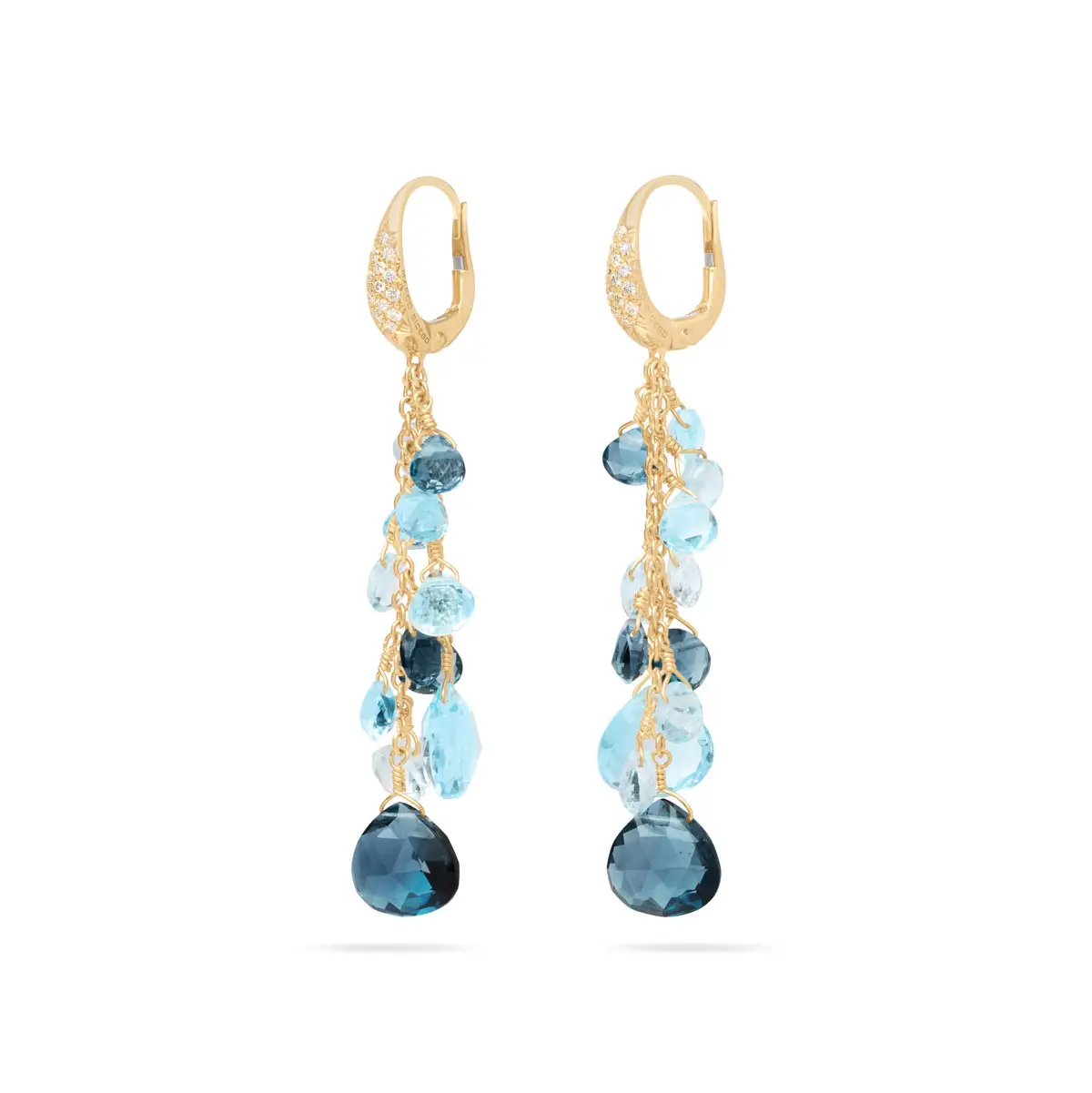 Délka náušnic je 50,00 mm, což jim dává výrazný visací charakter. Jsou zdobeny 23 kusy modrých topazů, každý v kapkovitém tvaru (Pear), routovém / rose brusu, což vytváří fascinující mozaiku modrých odstínů. Doplněno je 26 bílými diamanty, ve kulatém brusu (Round), s celkovou hmotností 0,14 ct, barvy G a čistoty VS, které přidávají jemný záblesk a kontrast.