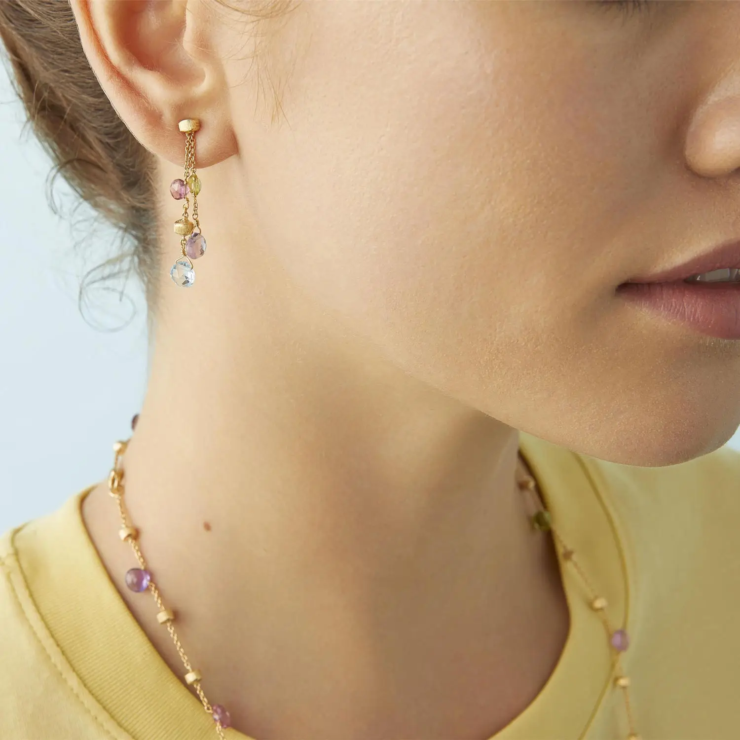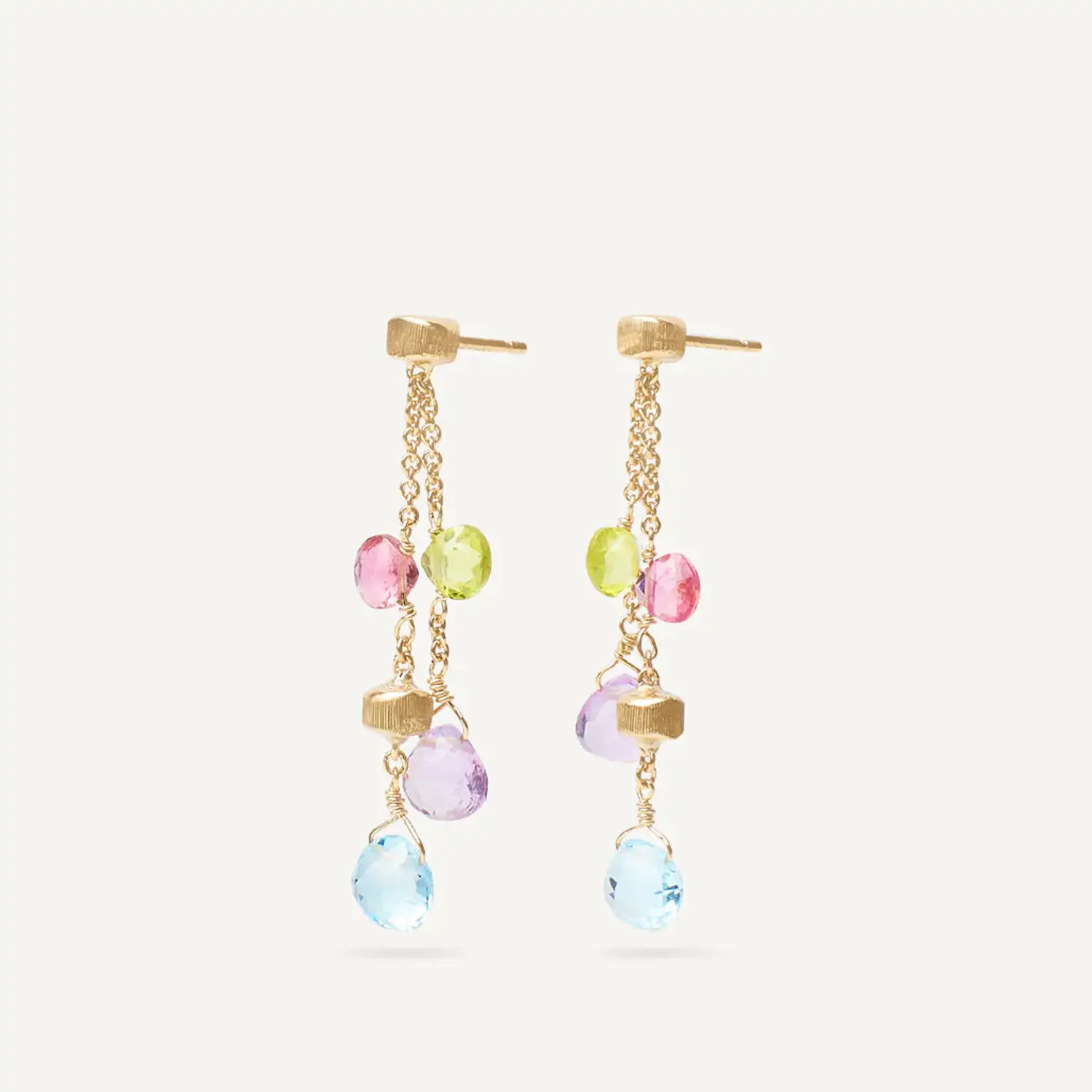 Luxusní zlaté náušnice Marco Bicego Paradise OB914 MIX01 Y 02 jsou vyrobeny z 18kt žlutého zlata (750/1000) a patří do ikonické kolekce Paradise, která je inspirována pestrými barvami přírodních drahých kamenů a světlem středomořské krajiny. Design náušnic kombinuje jemná zlatá vlákna s barevnými drahými kameny, které vytvářejí hravou a zároveň velmi elegantní kompozici.