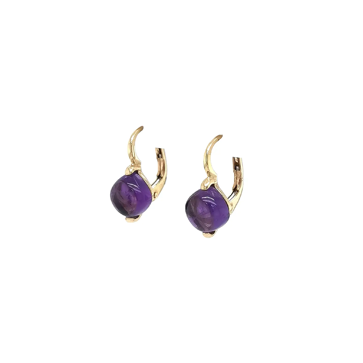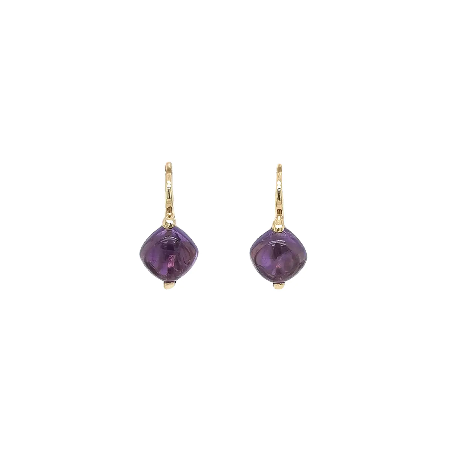 Tyto elegantní zlaté náušnice zdobené hladce broušenými fialovými amethysty okouzlí svou čistou a jemnou estetikou. Bohatý fialový tón kamene vyniká v hřejivém odstínu zlata, které jej pevně objímá v minimalistickém hladkém lůžku. Díky pohodlnému zapínání na klapku se náušnice příjemně nosí a bezpečně drží po celý den.