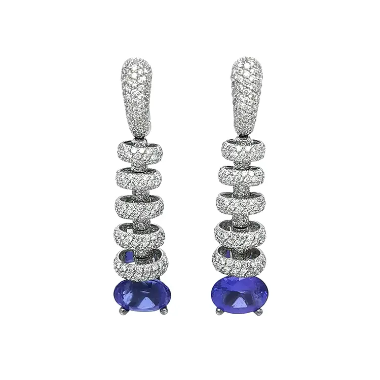 Dominantou šperku jsou dva přírodní tanzanity o celkové váze 5,74 ct, každý tvaru oválu (8,65 × 6,45 mm), jejich modrá barva symbolizuje eleganci a klid. Doplněny jsou 234 přírodními bílými diamanty s celkovou hmotností 2,47 ct, ve tvaru round, velikosti 1,20 mm, barva G, čistota VS — dohromady vytvářejí zářivý kontrast k hluboké modři tanzanitů a dodávají náušnicím výjimečný třpyt.