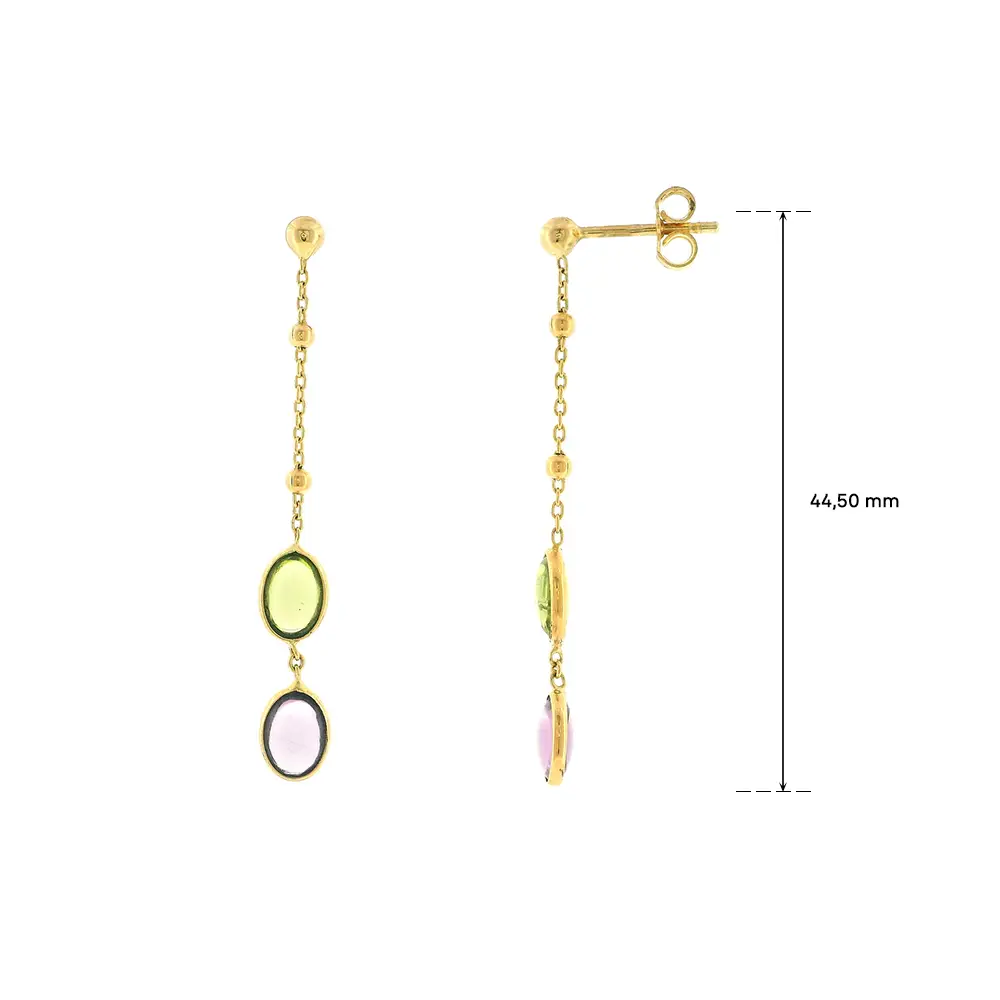 Náušnice jsou vyrobeny z kvalitního zlata a zdobené pečlivě zasazenými kameny v různých barvách, které krásně odrážejí světlo. Díky preciznímu zpracování a lehké konstrukci jsou ideální pro každodenní nošení i slavnostní příležitosti. Délka náušnic: 44,50 mm zajišťuje elegantní pohyb a zvýraznění linie krku.