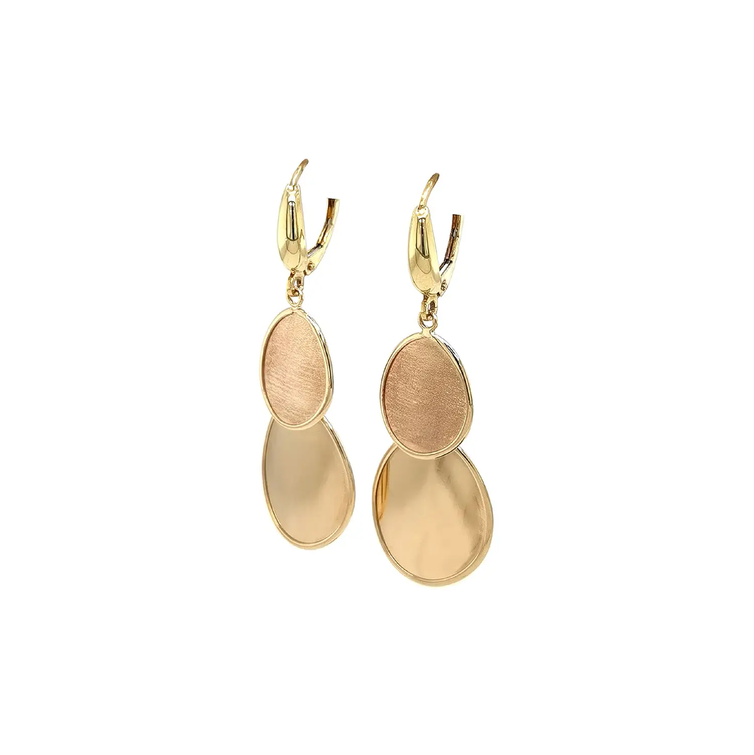 Tyto zlaté visací náušnice zaujmou originálním spojením dvou oválných tvarů, které se liší povrchovou úpravou – horní ovál je jemně matovaný, zatímco spodní se pyšní vysokým zrcadlovým leskem. Kontrast mezi strukturami vytváří harmonický, moderní efekt a dodává šperku osobitý styl. Každý pohyb rozjasní jejich povrch a nechá vyniknout teplý tón žlutého zlata.