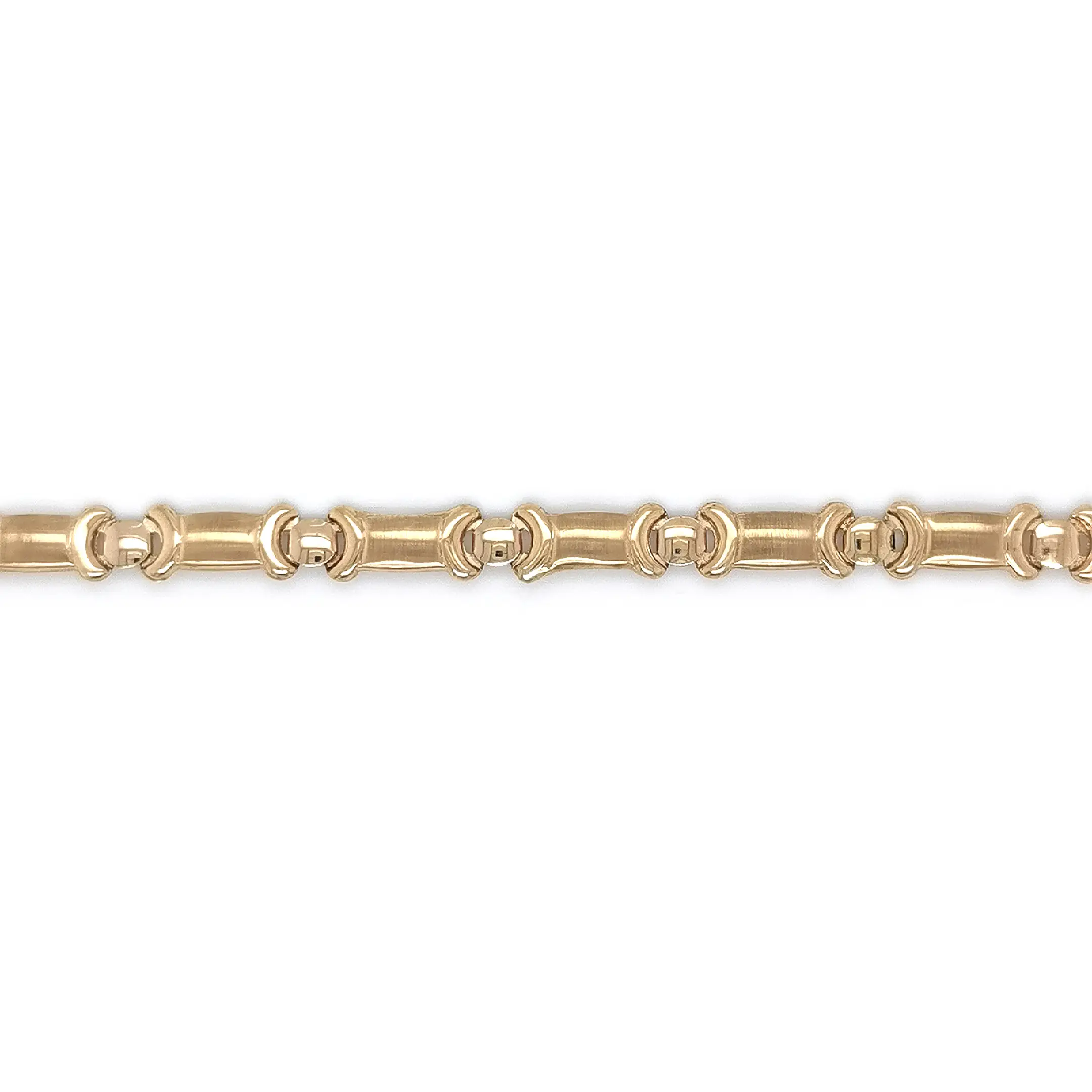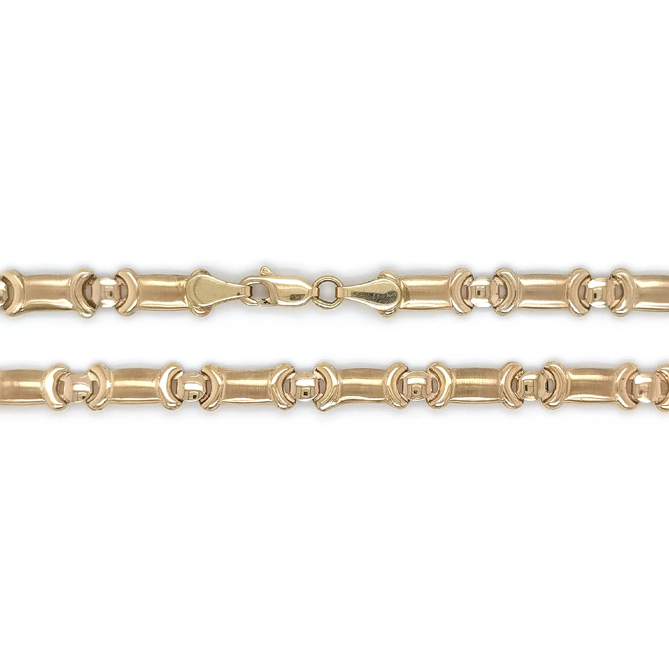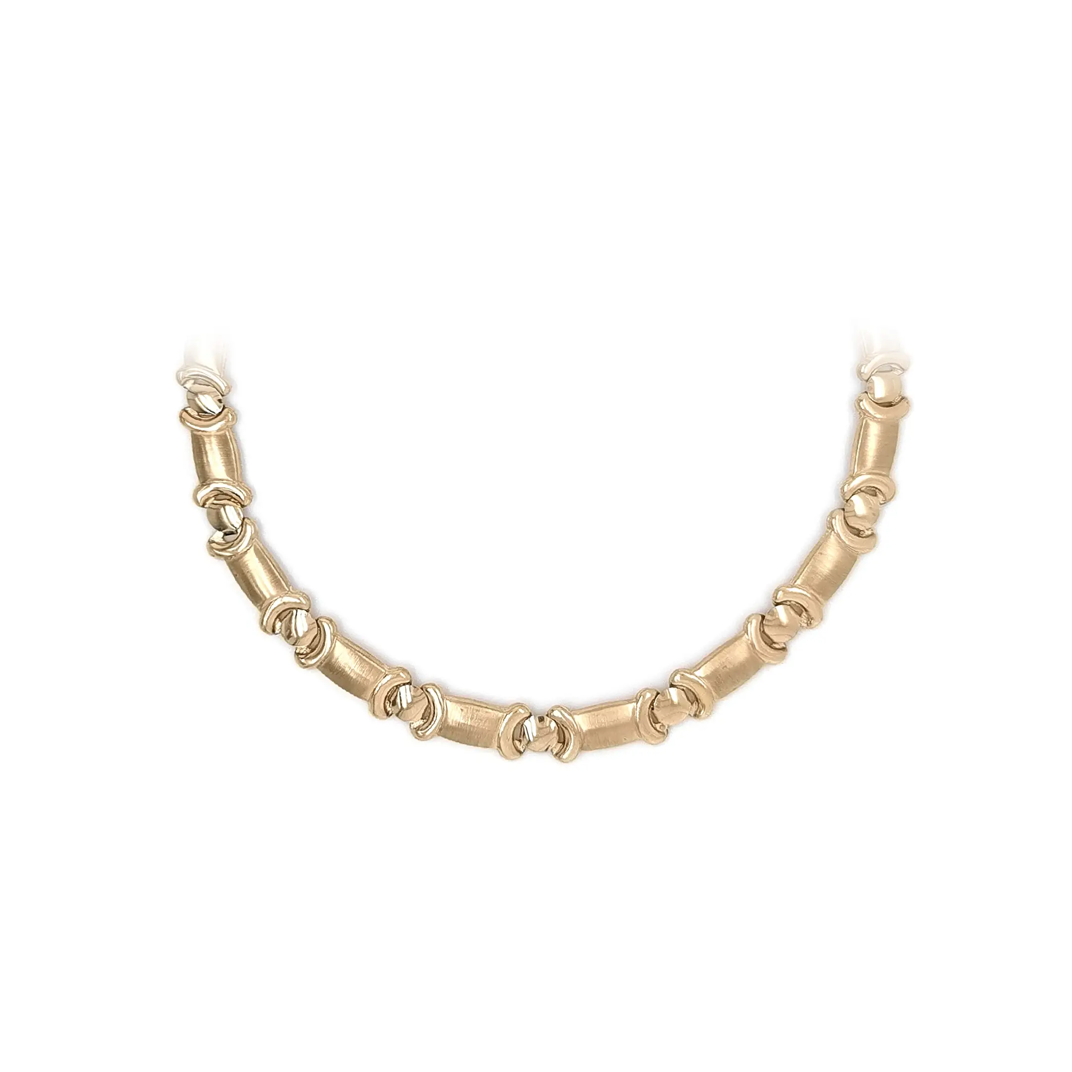 Zlatý článkový náhrdelník zaujme moderním pojetím klasického řetízku, kde se kombinuje lesklá a matná povrchová úprava. Válcovité články s jemně saténovým povrchem kontrastují s hladce leštěnými spojovacími prvky, což náhrdelníku dodává hloubku, strukturu a sofistikovaný vzhled. Design působí výrazně, přesto elegantně a nadčasově.