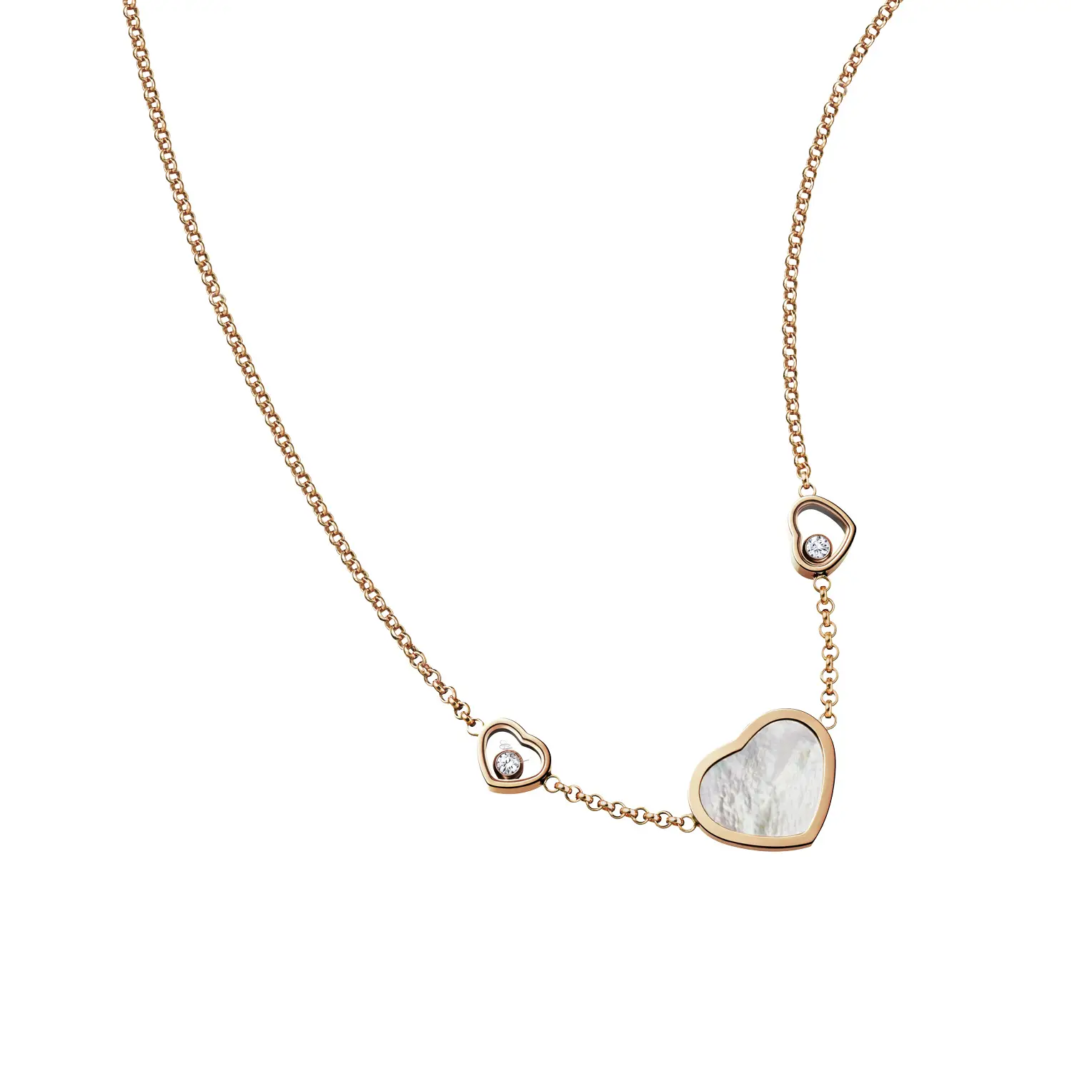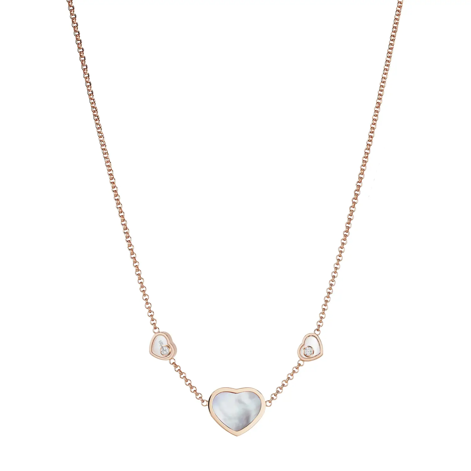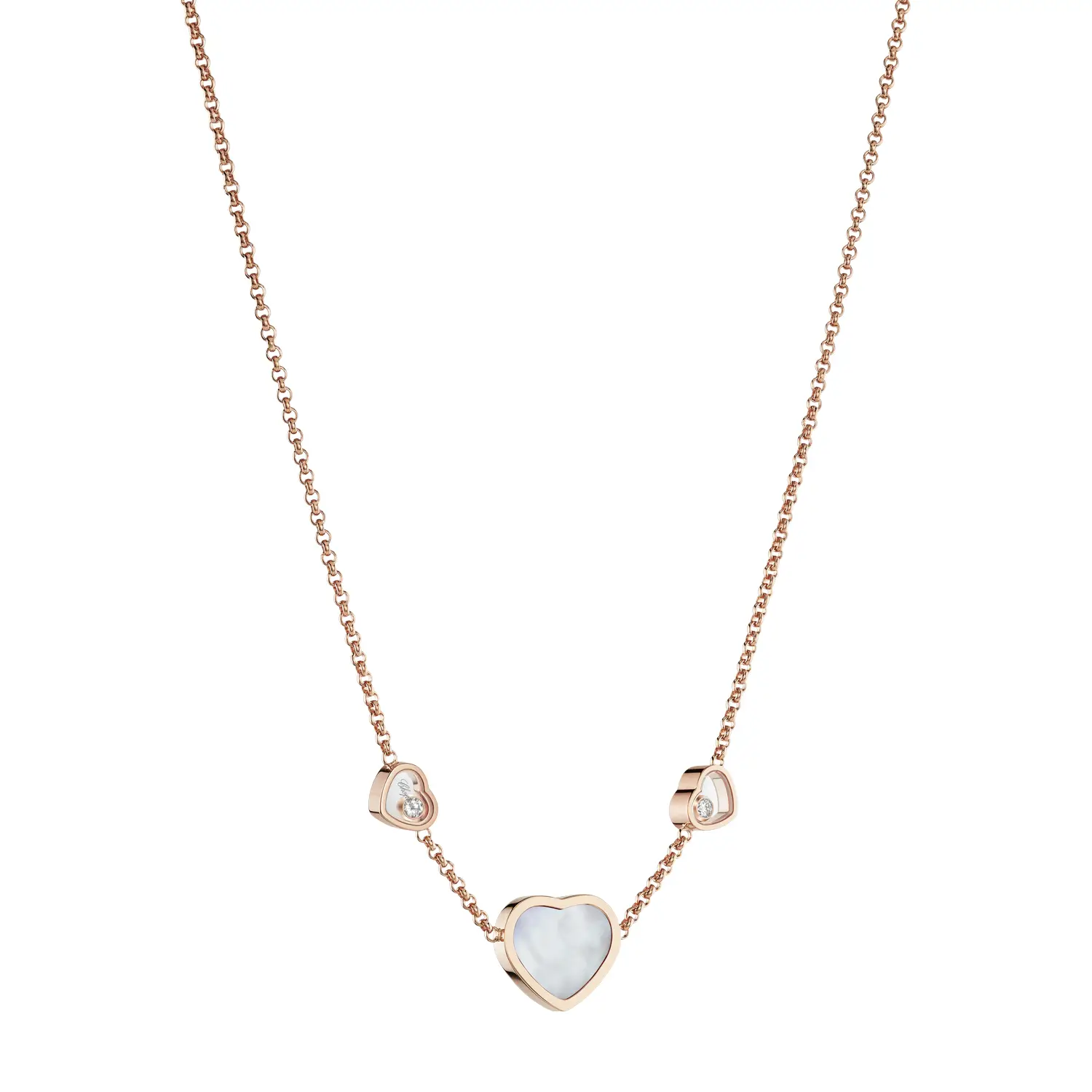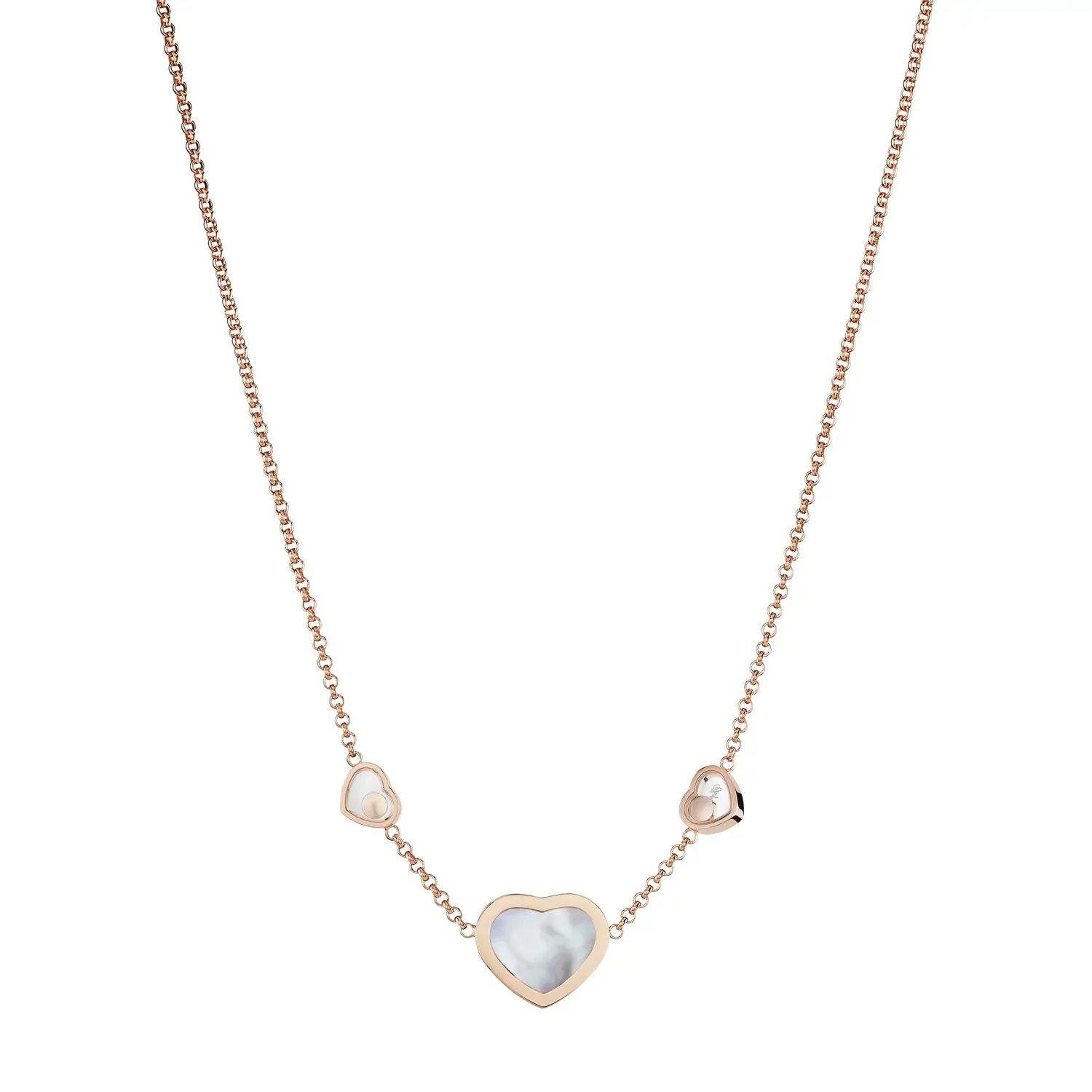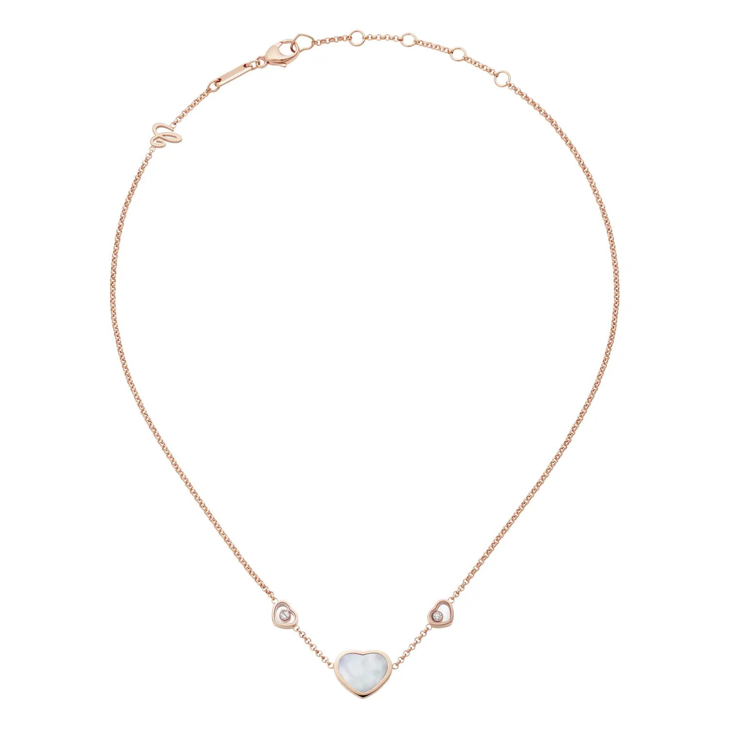 Tento elegantní náhrdelník z kolekce Happy Hearts ztělesňuje radost, něhu a ženský půvab, které jsou pro značku Chopard typické. Vyrobený z 18 kt růžového zlata, zdobený srdcem z pravé perleti a doplněný třpytivým diamantem, vyjadřuje filozofii značky – že malé diamanty dokážou velké věci. Kombinace jemného lesku perleti a teplého tónu zlata vytváří harmonický šperk s nádechem hravé elegance.