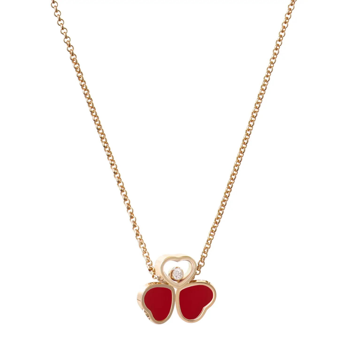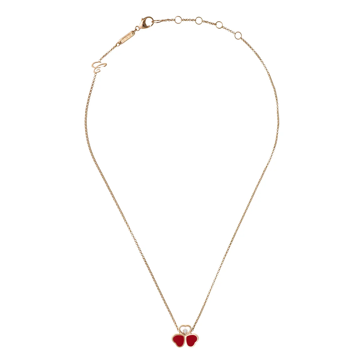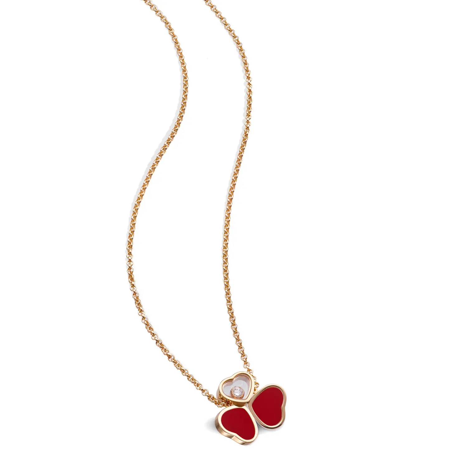 Náhrdelník Chopard Happy Hearts Wings 81A083-5811 je poetickým vyjádřením lehkosti, elegance a radosti ze života. Vyroben z 18karátového etického růžového zlata, zdobí jej dva srdcovité kameny z červeného karneolu a volně pohybující se diamant umístěný ve středovém srdci. Tvar motýlích křídel symbolizuje svobodu, jemnost a ženskost – hodnoty, které dokonale vystihují ducha kolekce Happy Hearts Wings.