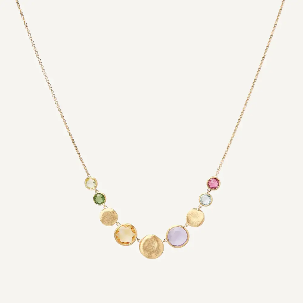 Dominantním prvkem náhrdelníku je šestice přírodních polodrahokamů v barevné kombinaci, precizně broušených do tvaru round o rozměrech 4× 5 mm a 2× 8,80 mm. Jejich zářivé odstíny vytvářejí harmonickou paletu, která připomíná atmosféru a barvy Jaipuru.