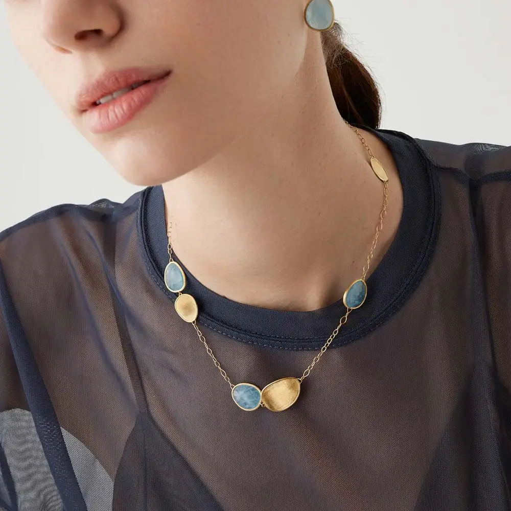Zlatý náhrdelník Marco Bicego Lunaria CB1981 AQD Y představuje dokonalou rovnováhu mezi přírodní krásou a italským zlatnickým uměním. Vyroben z 18kt (750/1000) žlutého zlata s lesklou a matnou povrchovou úpravou, působí elegantně a jemně zároveň. Délka 42 cm umožňuje přirozené usazení kolem krku, čímž vytváří dojem lehkosti a sofistikované harmonie.
