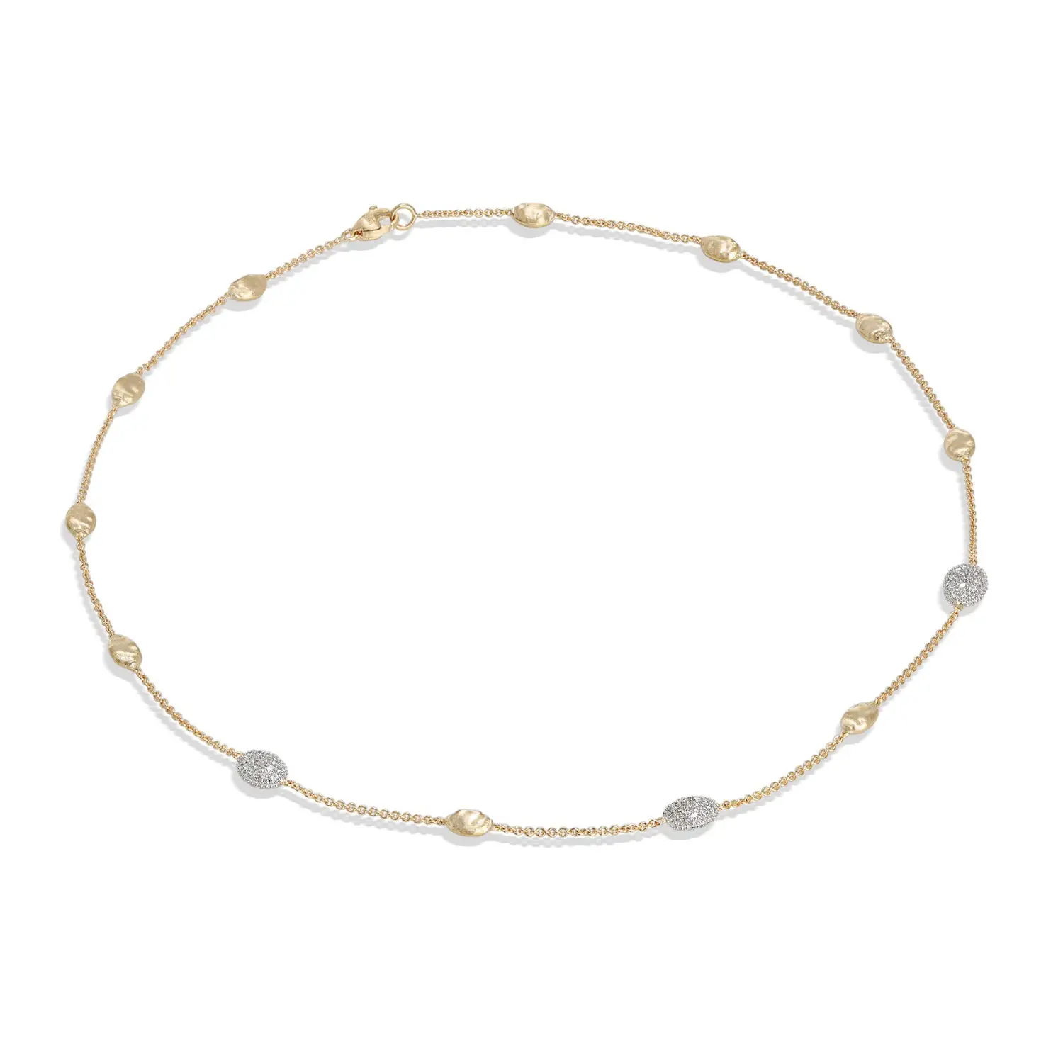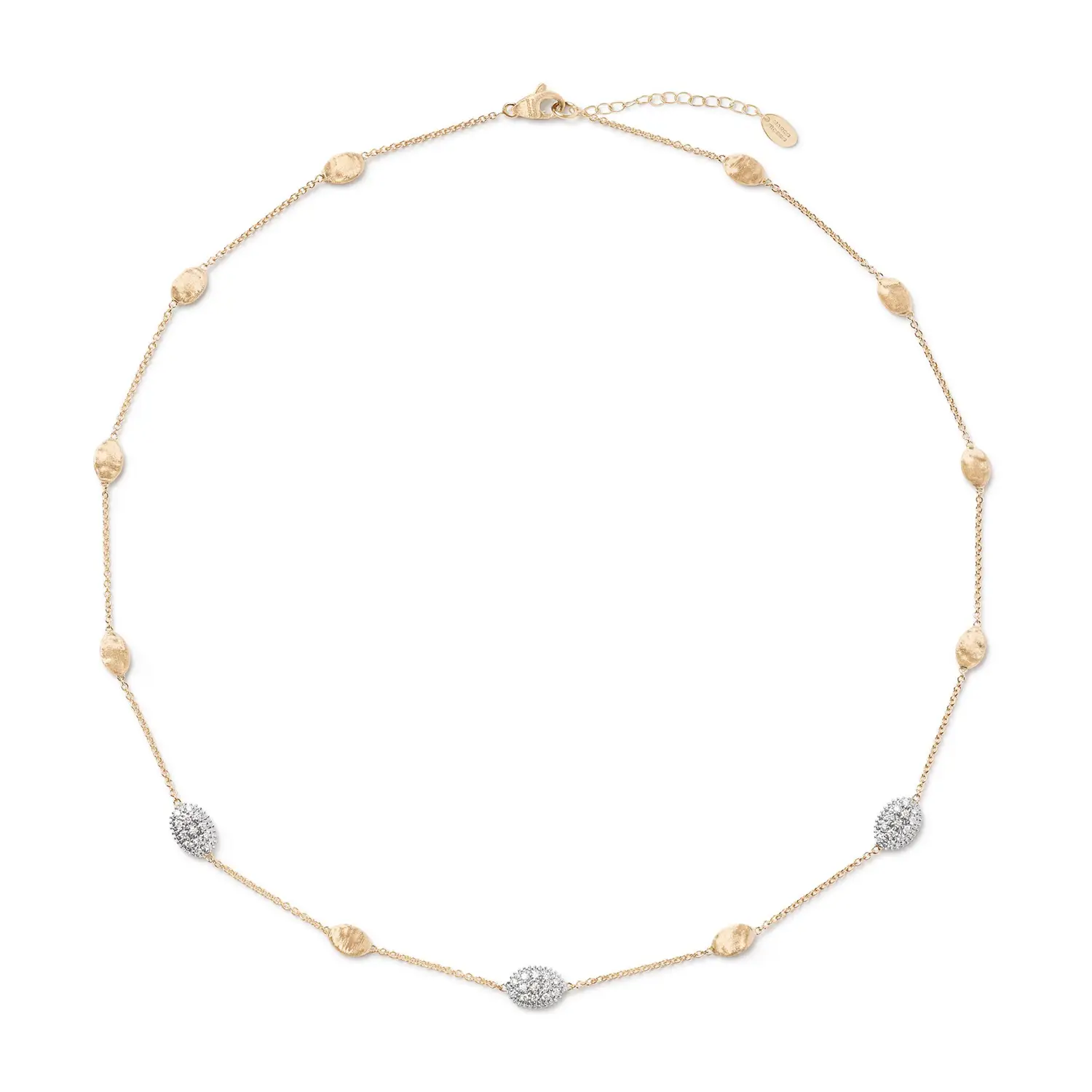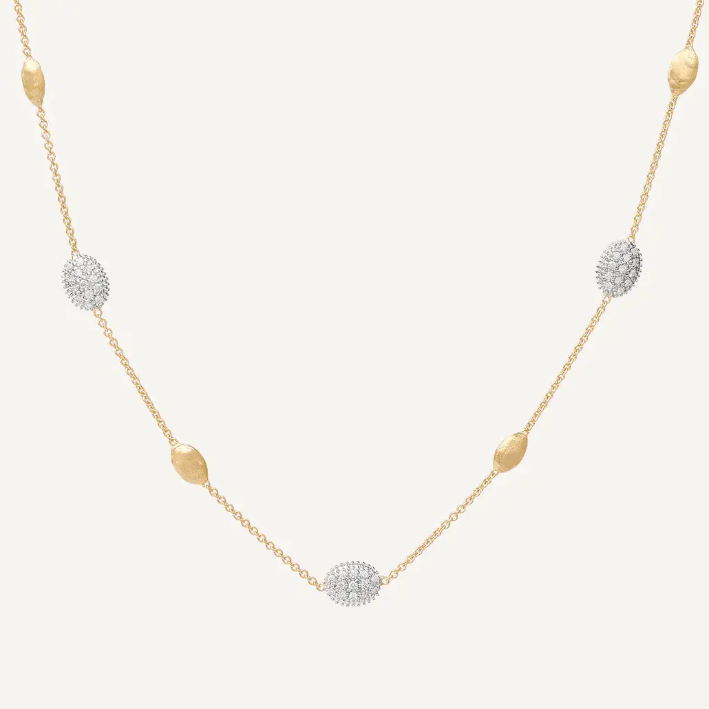 Tento luxusní náhrdelník z kolekce Marco Bicego Siviglia je vyroben z 18kt žlutého zlata (750/1000) a zdoben kombinací lesklé a matné povrchové úpravy, která je typická pro ruční zlatnickou techniku značky. Délka 42 cmzajišťuje, že náhrdelník krásně sedí na dekoltu a působí elegantně a nadčasově.