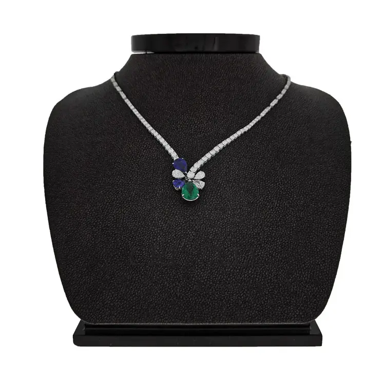 Zlatý náhrdelník s barevnými drahokamy je výrazný šperk, který spojuje noblesu vysokého šperkařství s jiskřivou hrou barev. Září díky 18kt zlatu 750/1000 v bílé barvě s lesklým povrchem; architektura náhrdelníku zvýrazňuje centrální drahokamy a vytváří luxusní siluetu vhodnou pro výjimečné příležitosti i večerní styling.