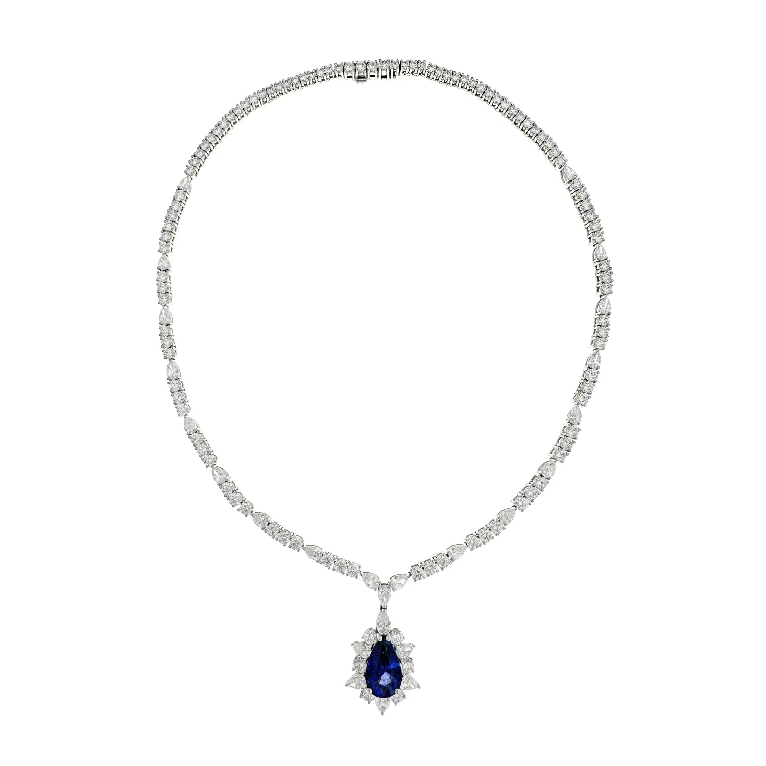 Náhrdelník Beny Jewellery se safírem a diamanty je ztělesněním královské elegance a absolutní preciznosti. V samém středu šperku září přírodní safír o váze 8,17 ct v brusu Pear, jehož hluboký modrý odstín symbolizuje nekonečnost, moudrost a sílu. Obklopuje jej aura oslnivých diamantů, které společně vytvářejí mistrovské dílo světla a harmonie.