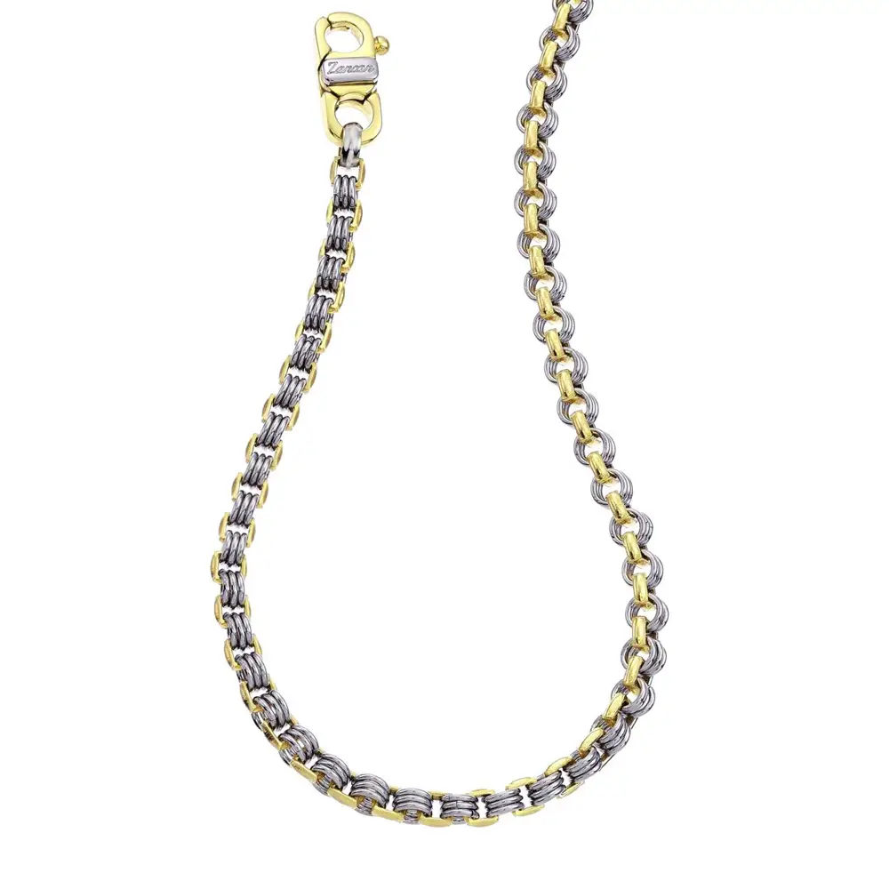 Elegantní řetízek značky Zancan vyniká nadčasovým designem a precizním zpracováním, které je pro italské šperkařství charakteristické. Kombinace bílého a žlutého zlata vytváří harmonický kontrast tónů, jenž šperku propůjčuje moderní a současně velmi sofistikovaný vzhled. Vyvážené proporce a čisté linie činí z modelu univerzální doplněk vhodný pro každodenní nošení.