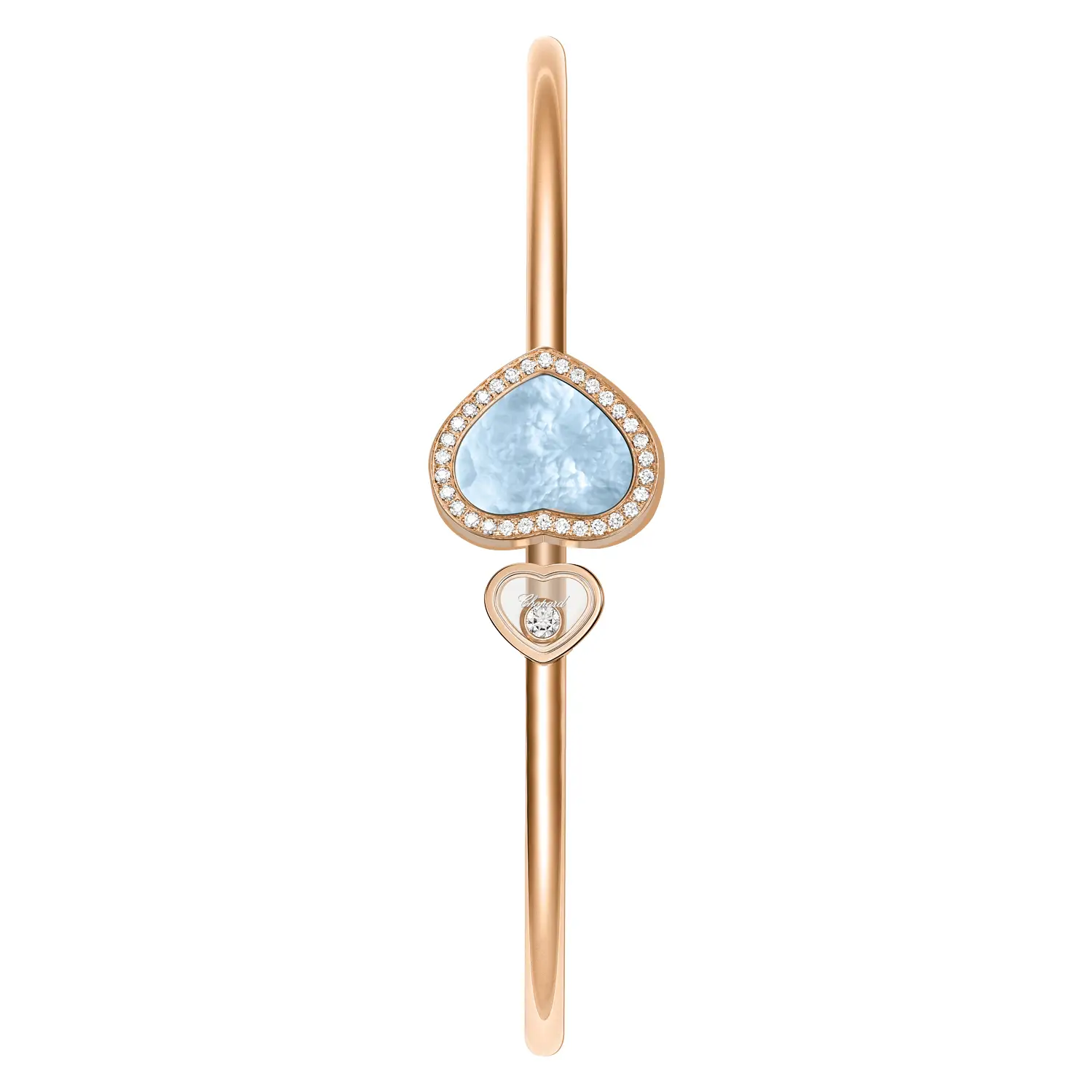 Náramek Chopard Happy Hearts 85A074-5343 představuje dokonalou rovnováhu mezi jemností, elegancí a radostí ze života. Vyroben z 18karátového etického růžového zlata, zdobí jej srdce z tyrkysové perleti a brilantní diamanty o celkové hmotnosti 0,19 ct, které dodávají šperku jemný, ale výrazný třpyt. Kombinace teplého zlata a osvěžující modré barvy vytváří dojem svěžesti a ženského půvabu.