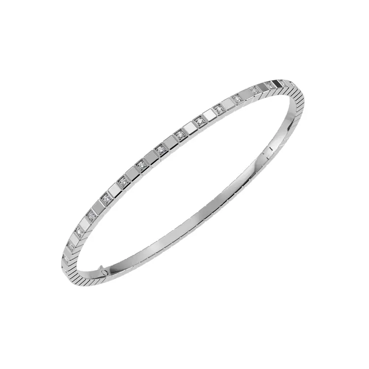Zlatý náramek Chopard Ice Cube 857702-1010 představuje moderní eleganci inspirovanou čistými liniemi ledu. Tento luxusní šperk je vyroben z 18kt bílého zlata (750/1000) s dokonale lesklým povrchem, který mu dodává sofistikovaný a zářivý vzhled. Náramek má délku 17 cm a patří mezi pevné náramky ve stylu bangle, což z něj činí ikonický doplněk vhodný jak pro každodenní nošení, tak pro slavnostní příležitosti.