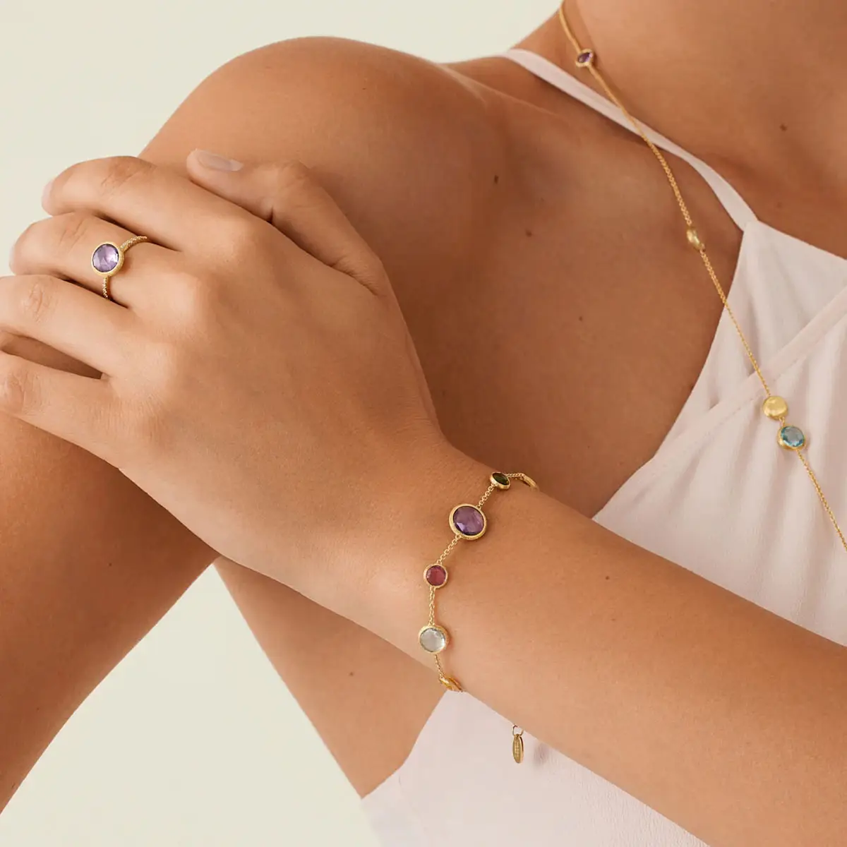 Tento šperk z kolekce Jaipur Colour je osazen 7 přírodními polodrahokamy v barevné kombinaci, broušenými technikou routového (rose cut) brusu do tvaru round. Každý kámen je jedinečný a vyzařuje vlastní odstín – od tónů moře přes odstíny růžové, zelené či jantarové. Společně vytvářejí kaleidoskopický efekt, který oživuje zlatý základ náramku.