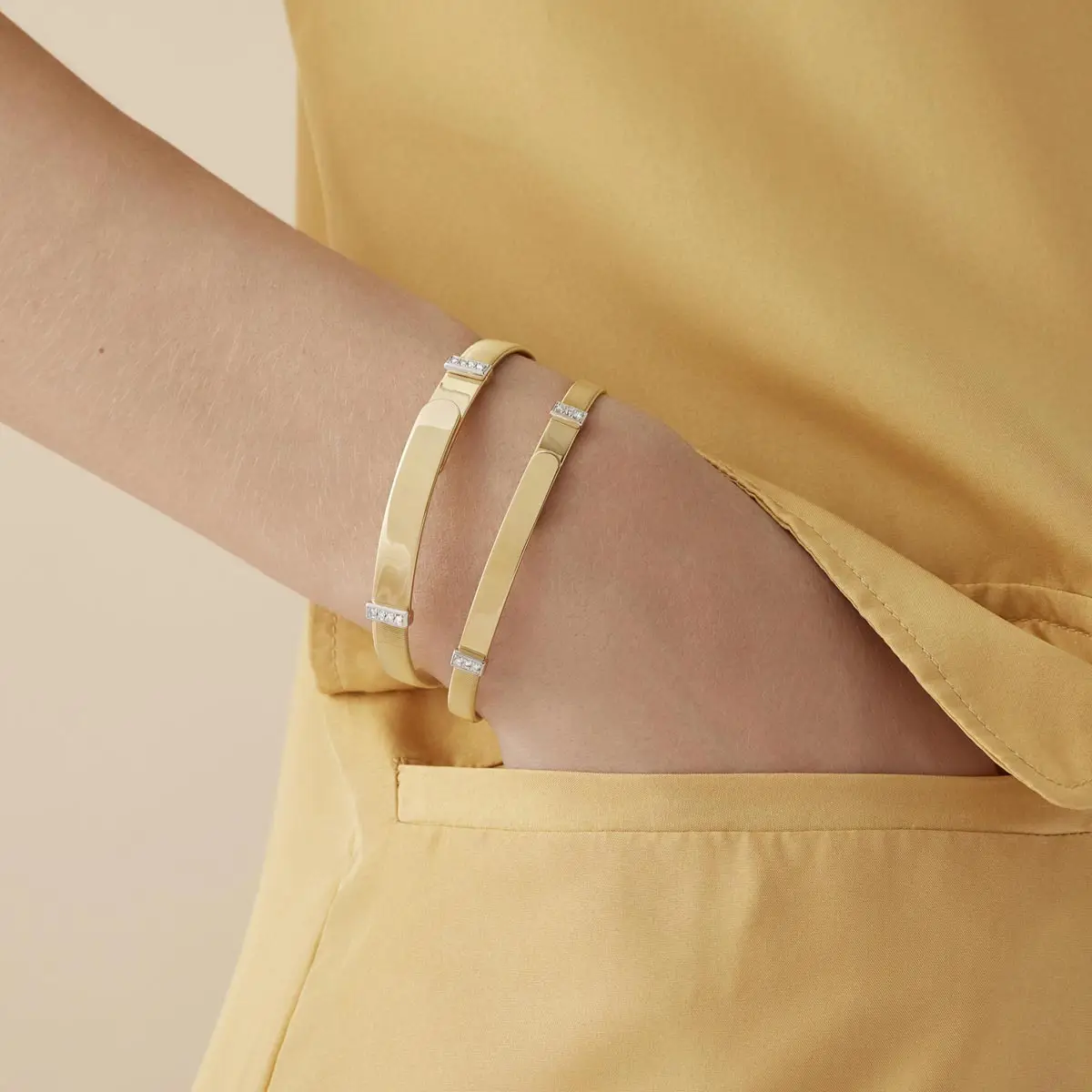 Tento exkluzivní náramek z kolekce Masai je osazen přírodními bílými diamanty o celkové hmotnosti 0,06 ct, barvy G a čistoty VS, broušenými do tvaru round. Lesk diamantů decentně zvýrazňuje strukturu zlata a dodává náramku nevtíravý, ale luxusní půvab. Inspirací pro kolekci Masai byla síla a elegance africké kultury — zlaté pásy se proplétají do elegantního tvaru připomínajícího rytmus a pohyb.